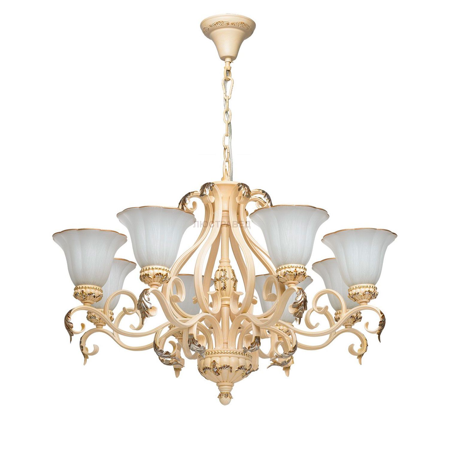 Кованое металлическое основание молочного цвета, плафоны из стекла с перламутровым отблеском и декоративной крашеной каёмкой