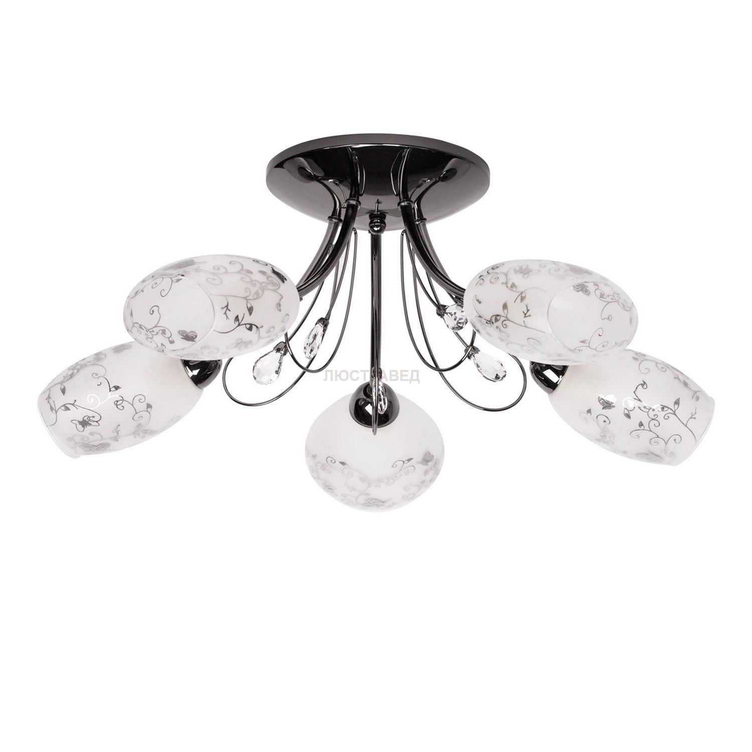 Металлическое основание цвета темного никеля, декоративные элементы из хрусталя, стеклянные плафоны