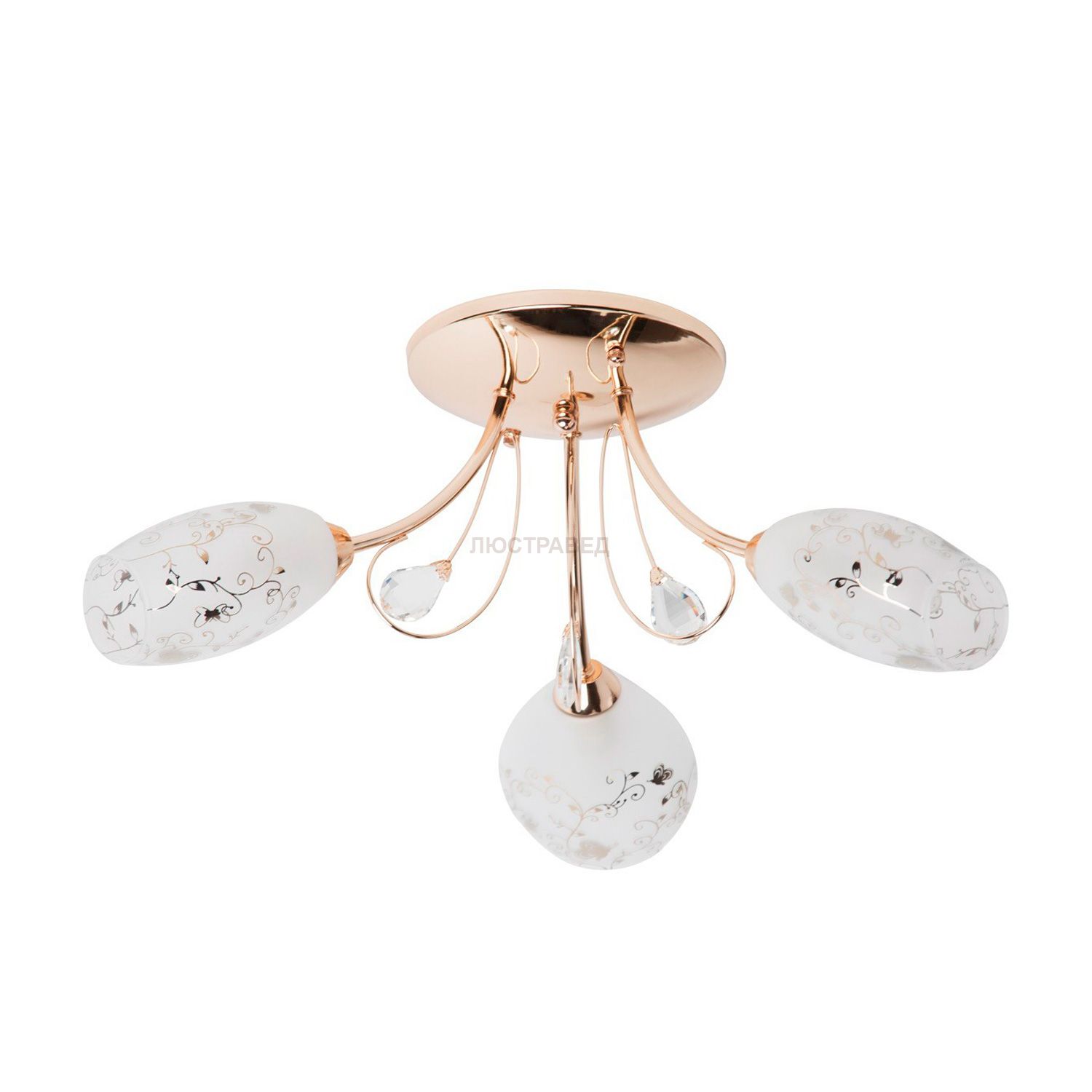 Металлическое основание цвета золота, стеклянные плафоны, декоративные элементы из хрусталя