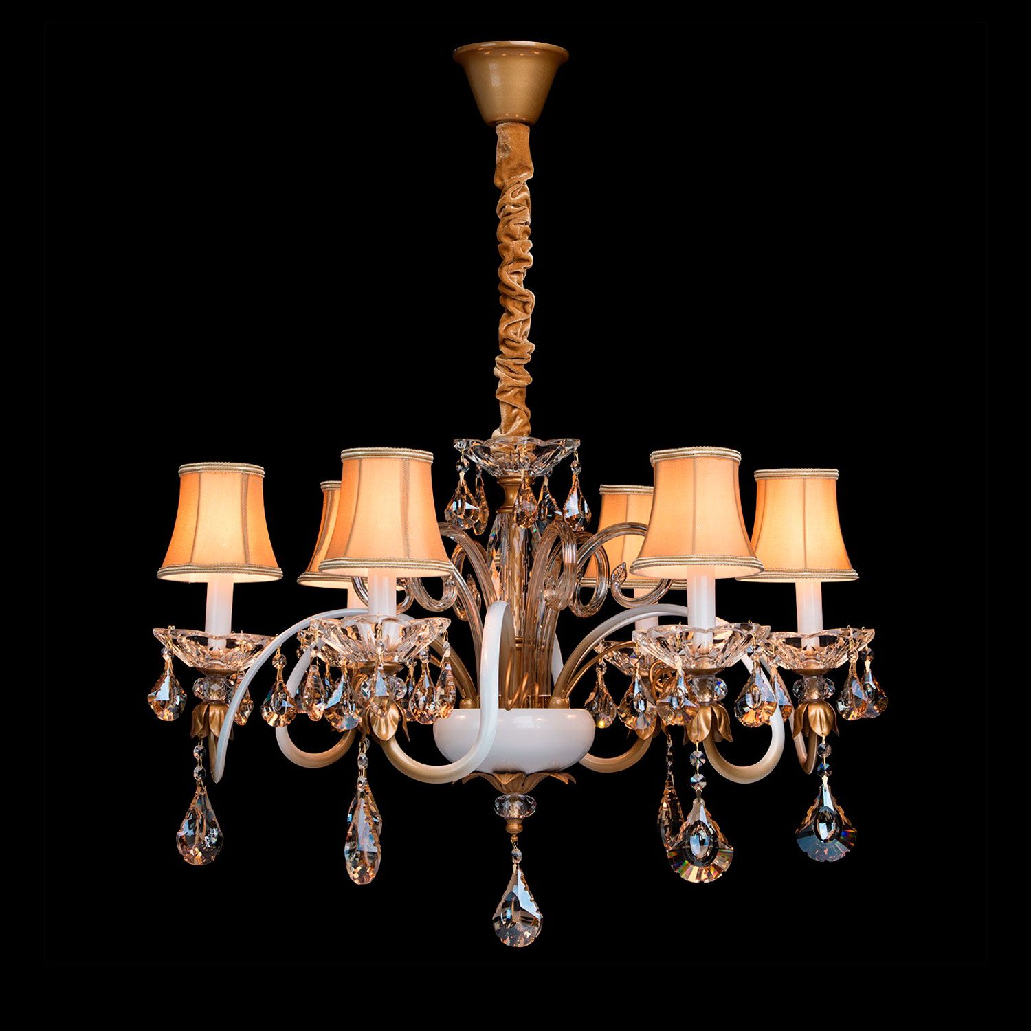 Металлическое основание белого и золотого цветов, декоративные элементы из выдувного стекла, хрусталь прозрачный и цвета топаза, атласные абажуры.