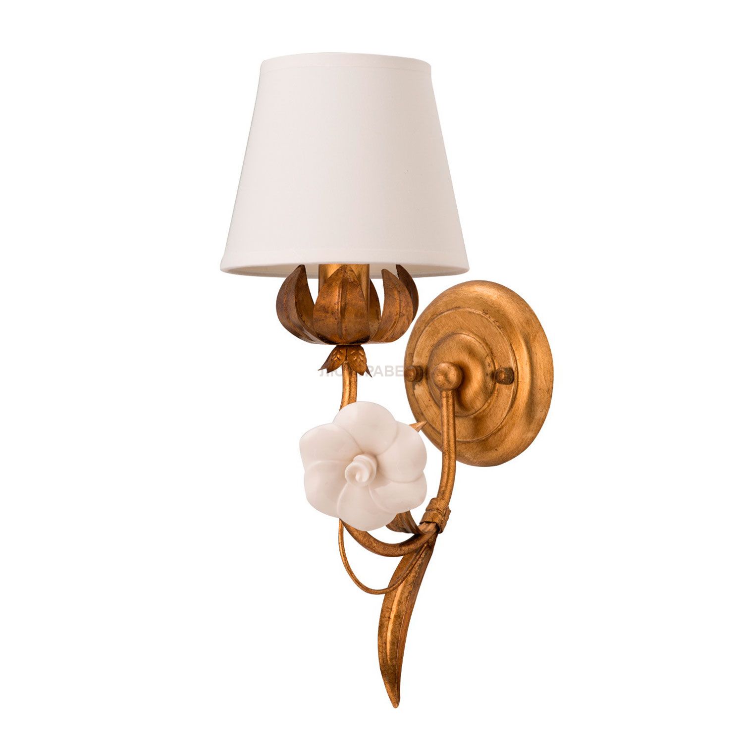 Металлическое основание цвета античного золота, сусальное золото, текстильные абажуры, деоративные элементы из фарфора.