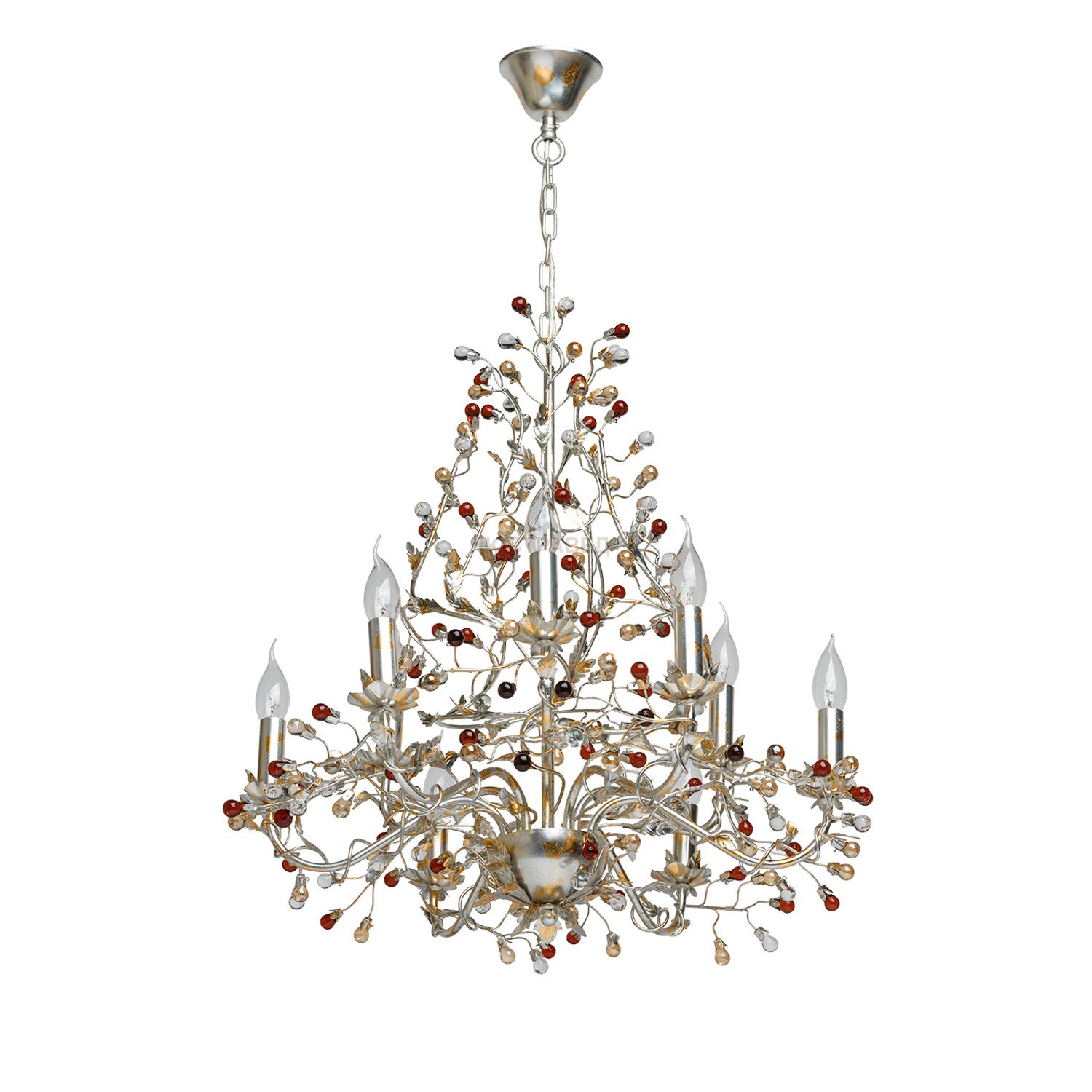 Арматура выполнена из сплава металла, обработана по технологии двухслойного покрытия: первый слой, основной - сусальное серебро, второй слой, декоративный - сусальное золото. Светильник декорирован элементами из прозрачного стекла и стекла, окрашенного в янтарный цвет и цвет шампань.