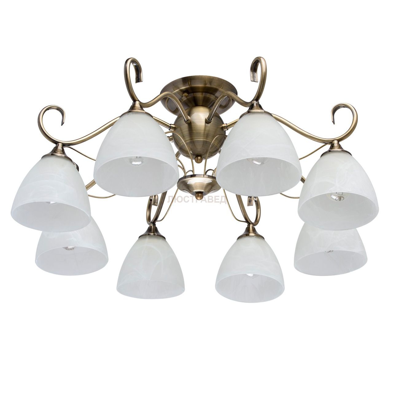 Основание выполнено из облегченной стали, гальванизировано в цвет античной бронзы. Плафоны: стекло с добавлением алебастра