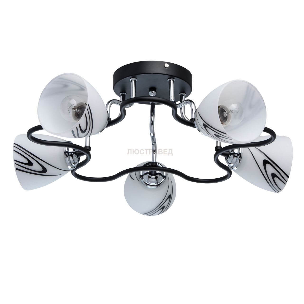 Металическое основание черного цвета, плафоны из стекла с рисунком.