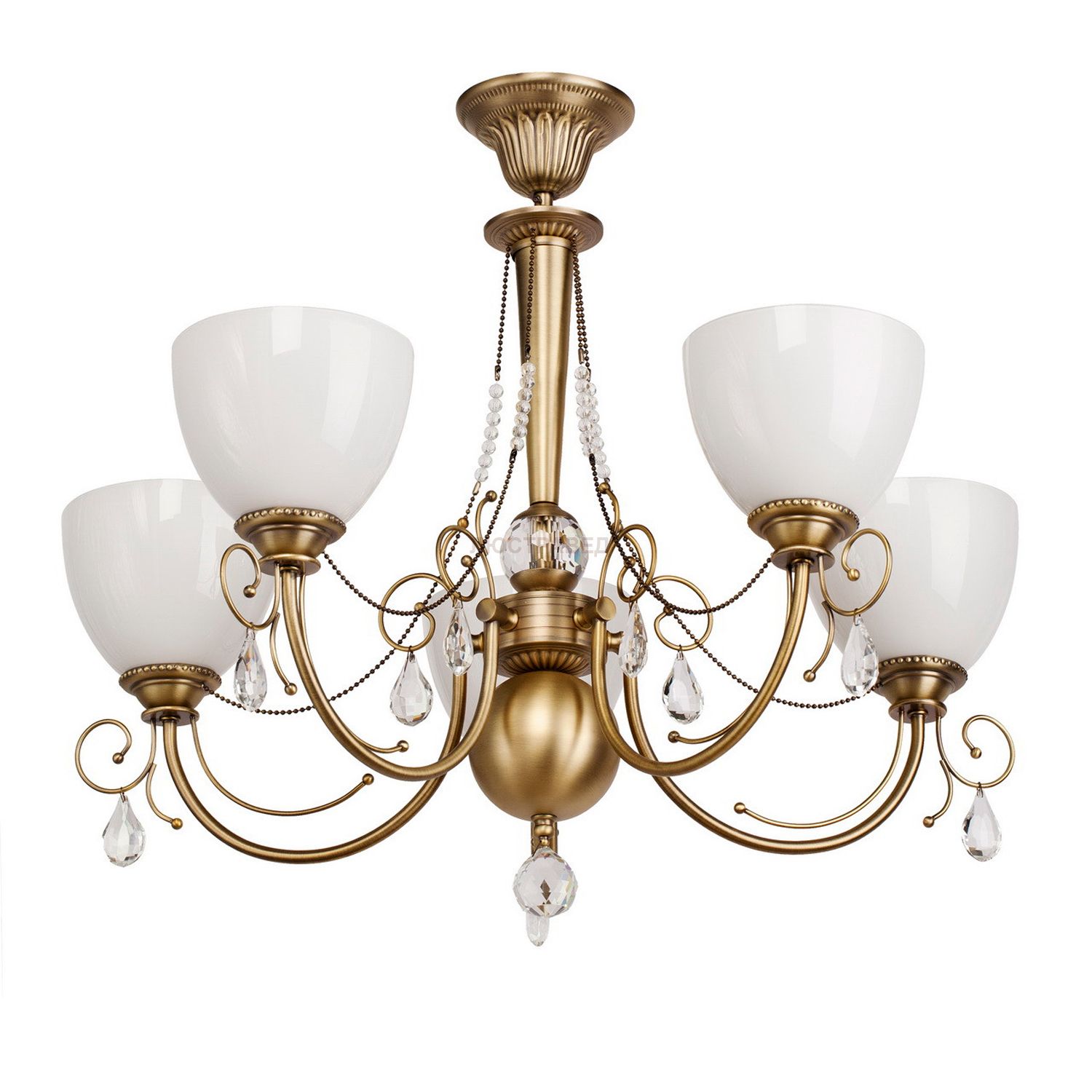 Металлическое основание цвета бронзы, ,декоративные элементы их хрусталя, плафоны из стекла