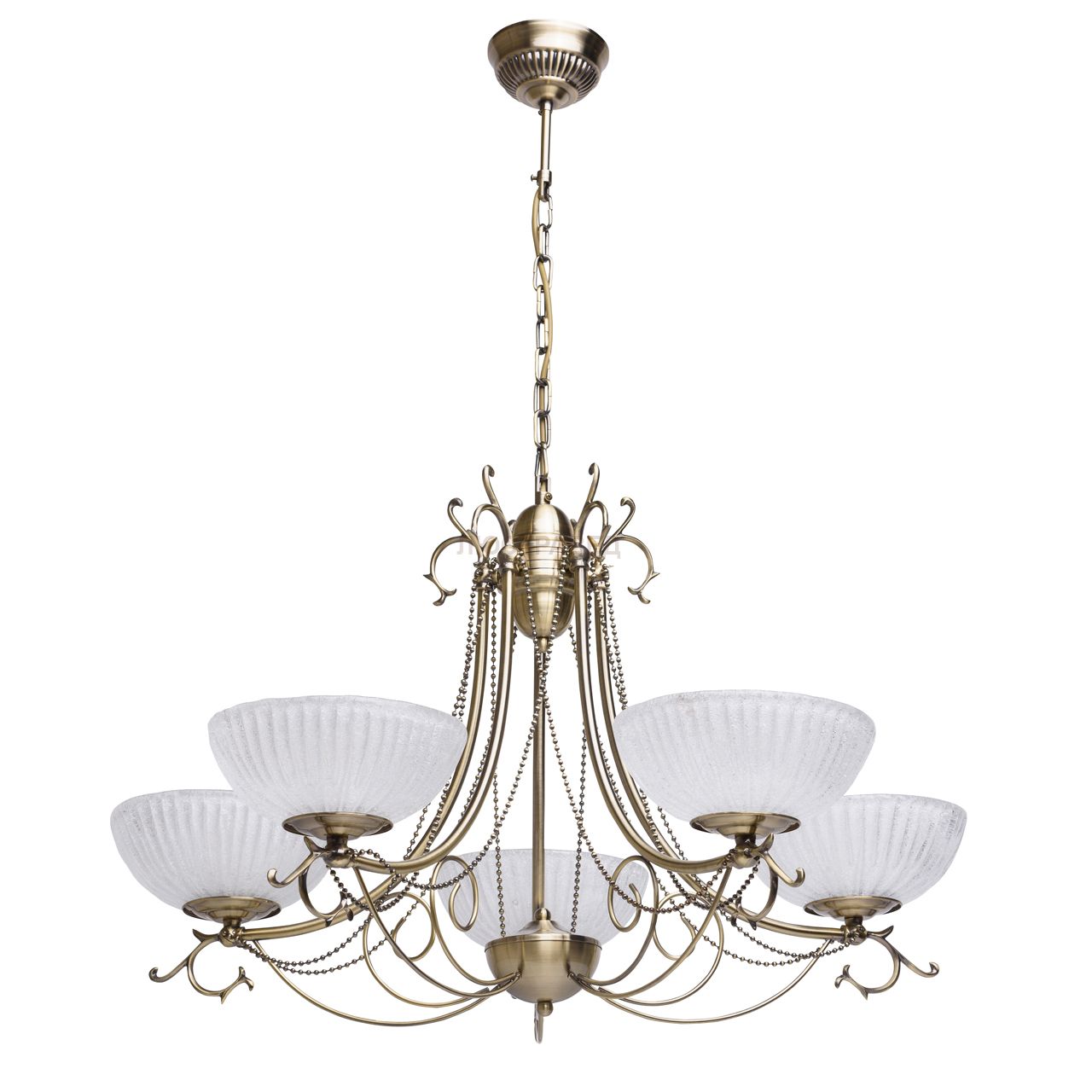 Изящный дизайн выполнен в стиле легкой ковки. Высокие параметры освещенности. Качественное исполнение всех элементов. Плафоны с покрытием стеклянной крошкой. Декоративные элементы из бронзы. Крепление к потолку на крючок.