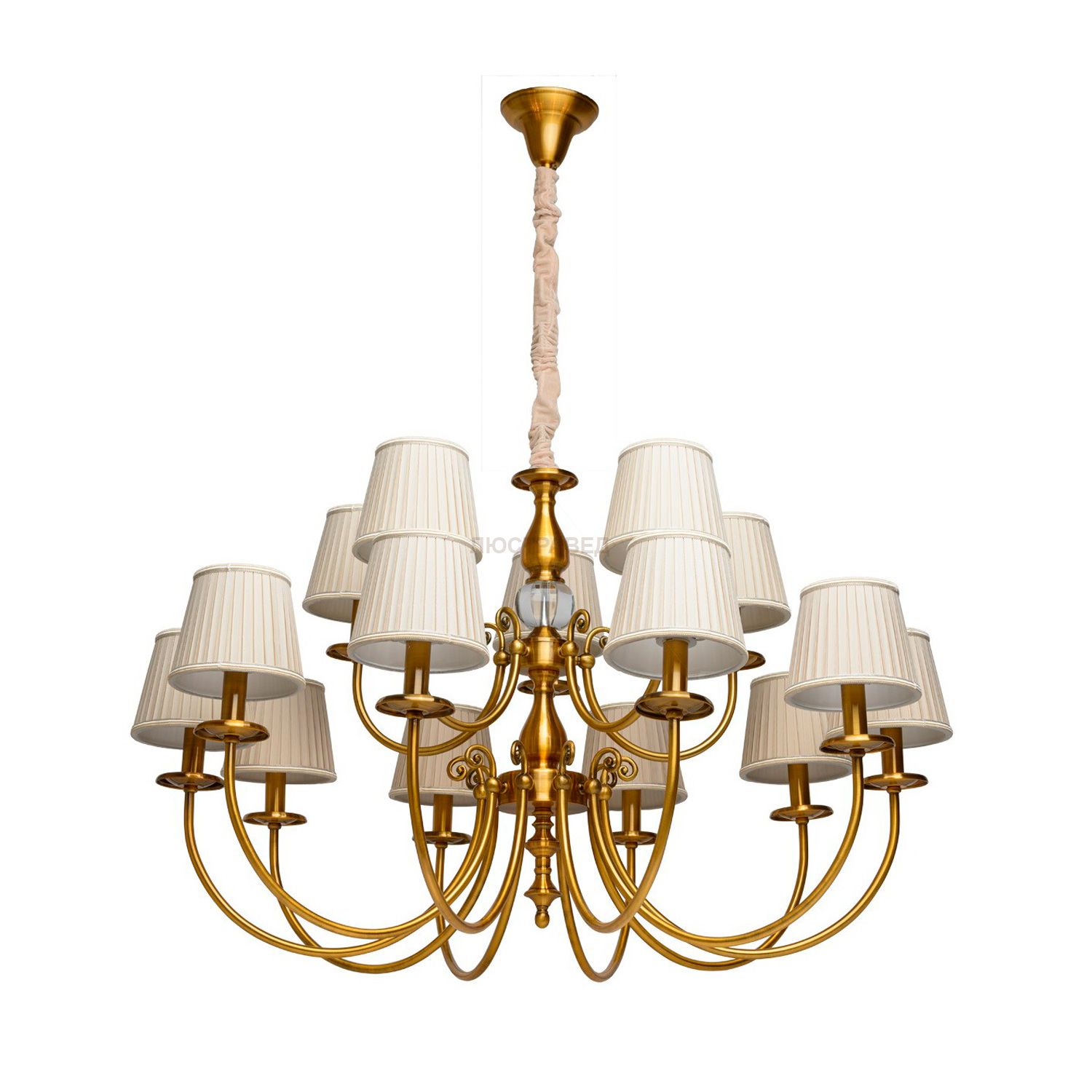 Металлическое основание цвета золоченой бронзы, декоративные элементы из хрусталя, текстильные абажуры