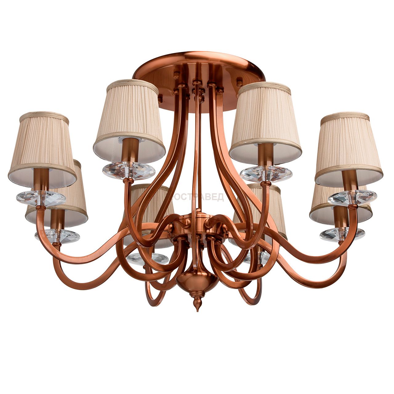 Металлическое основание цвета красной бронзы, декоративные элементы из хрусталя, текстильные абажуры