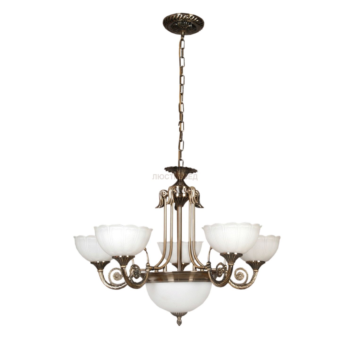 Светильник выполнен в лучших традициях классического стиля. Изыщный резной дизайн основания. Оригинальная цветочная форма стеклянных плафонов. Высокие параметры освещенности. Качественное исполнение всех элементов.