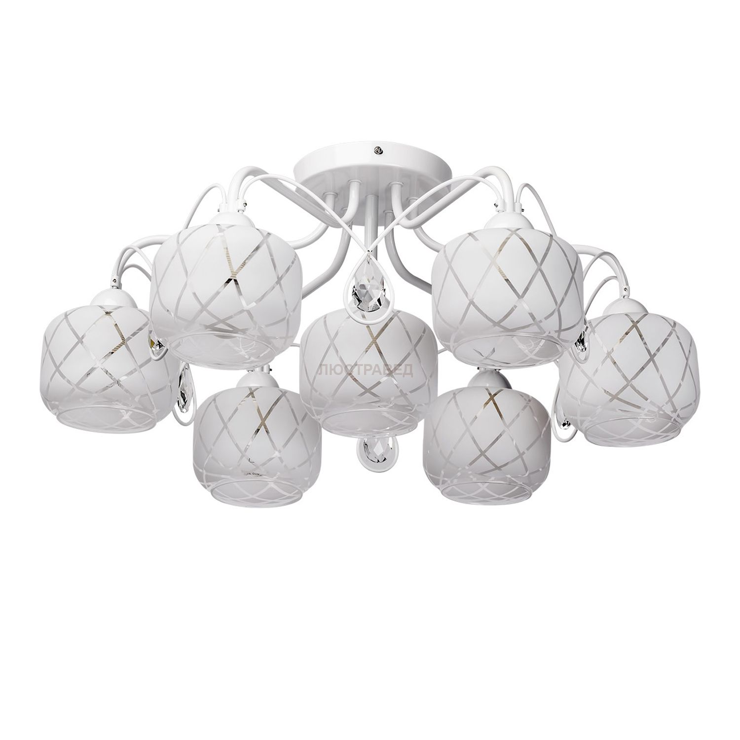 Лаконичный дизайн - плавные формы стеклянных плафонов эффектно сочетаются с изысканным хрусталем. Высокие параметры освещенности. В декоре используется хрусталь. Модное дизайнерское решение – сочетание арматуры белого цвета и белых плафонов. Демократичная цена!