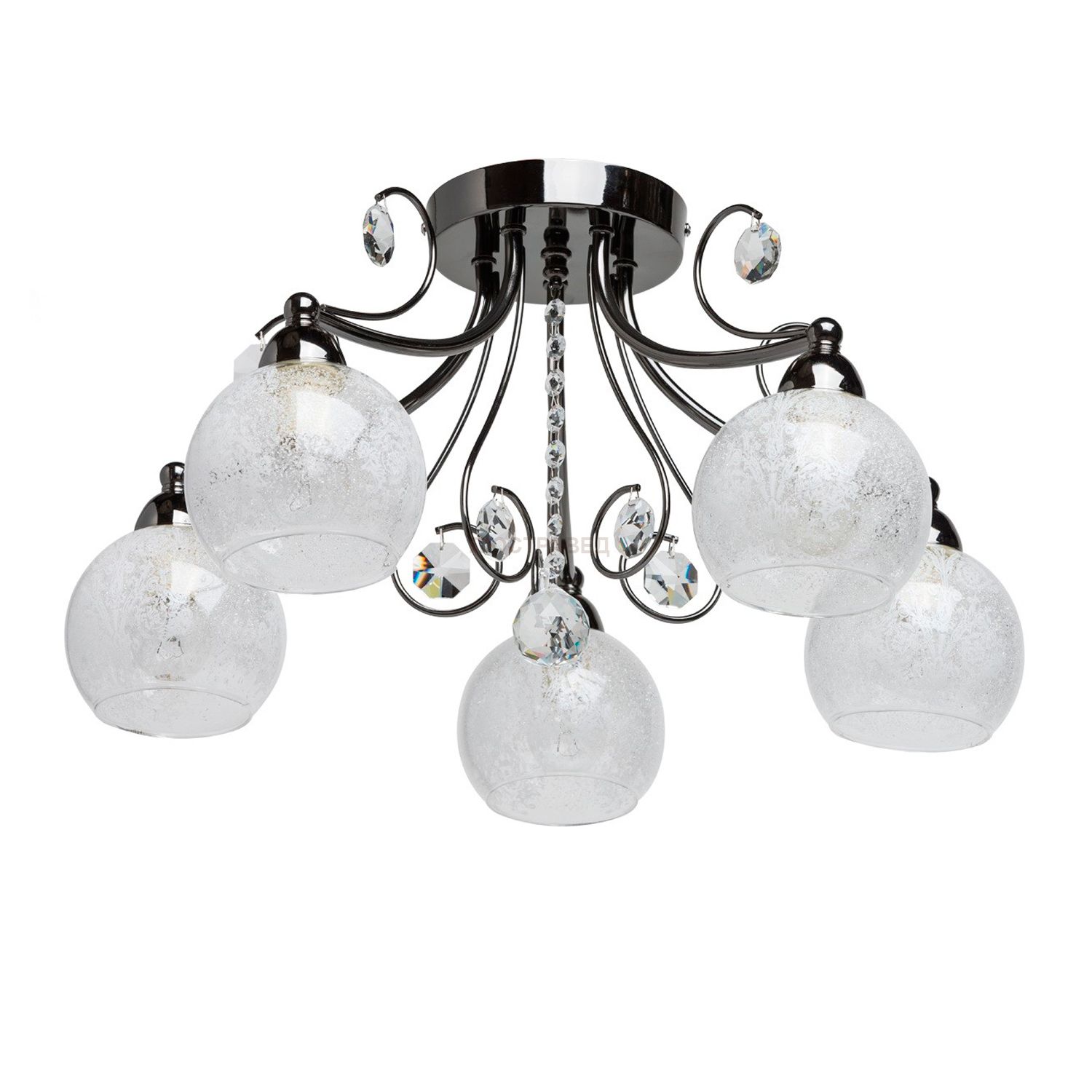 Металлическое основание цвета никеля, стеклянные плафоны, декоративные элементы из хрусталя