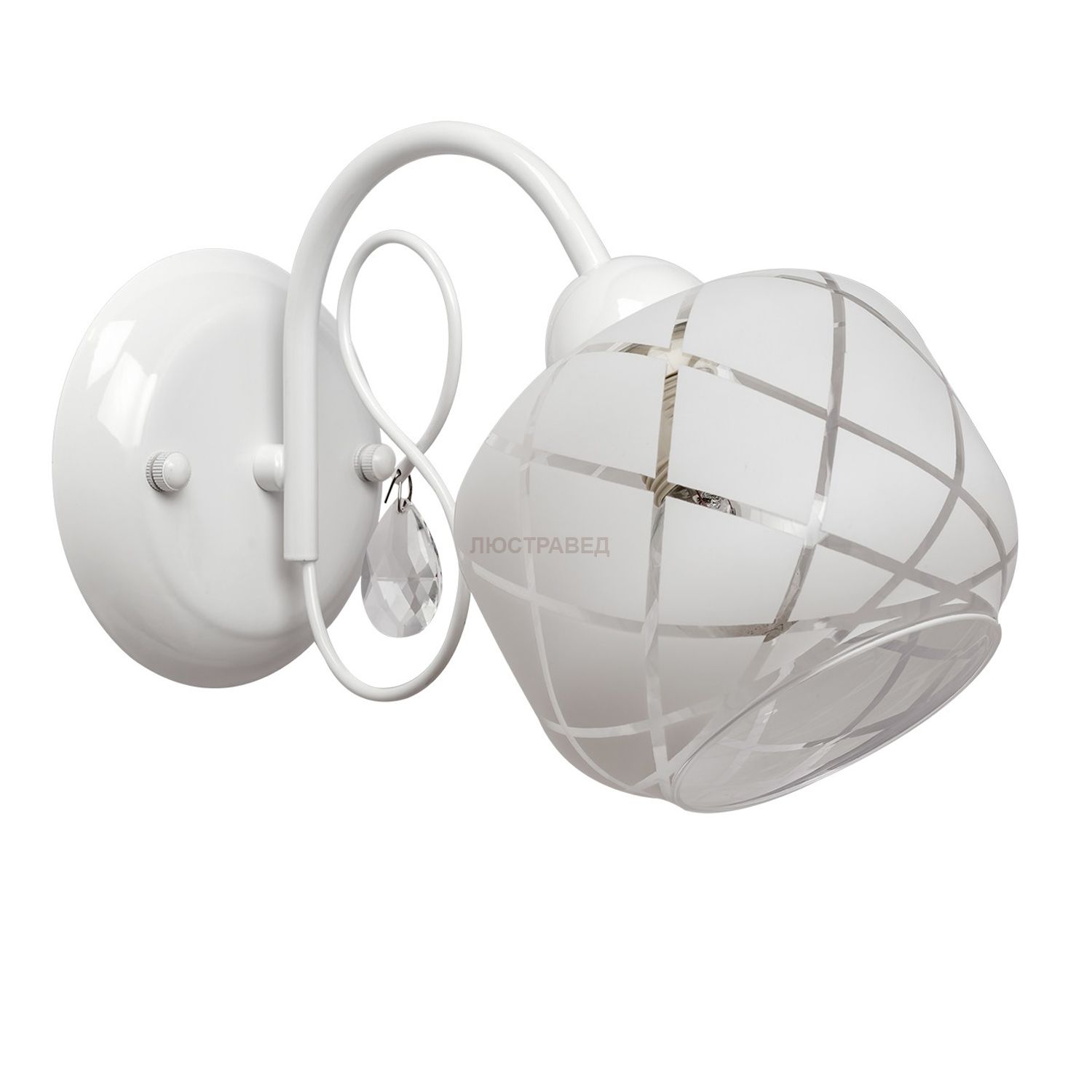 Металлическое основание белого цвета, стеклянный плафон, декоративная подвеска из хрусталя.
