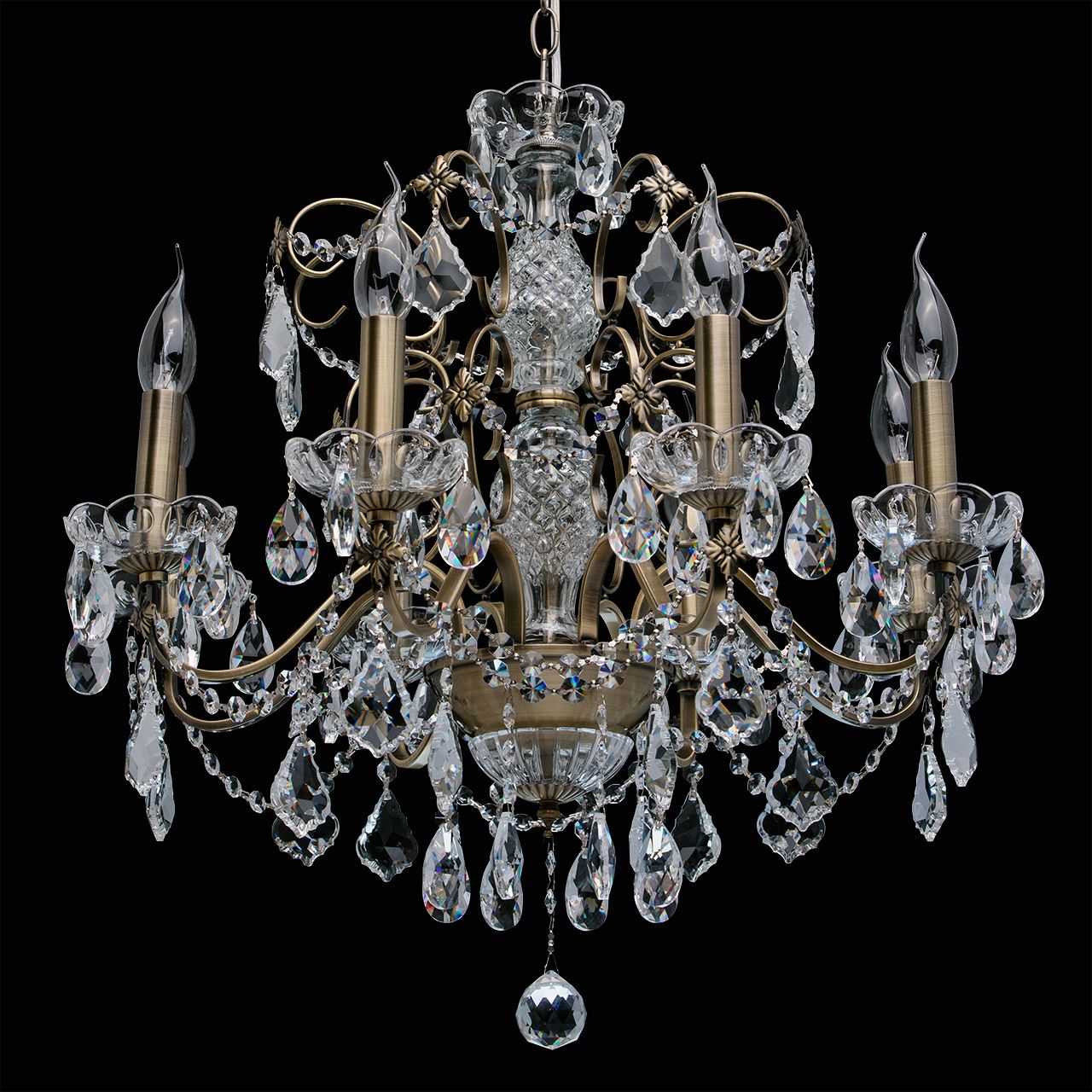 Арматура светильника выполнена из сплава железа и гальванизирована в цвет античной бронзы. Центральная ось декорирована прозрачным стеклом со сложным орнаментом. Розетки выполнены из прозрачного стекла, отлитого по форме. Светильник декорирован хрустальными подвесками 4-х видов: октагон, миндаль, дубовый лист, шар.