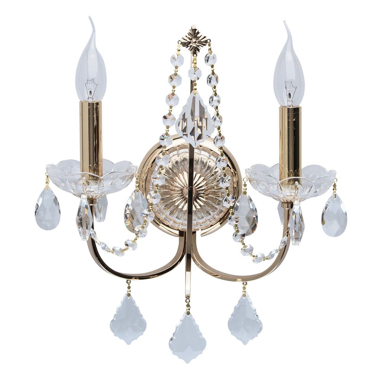 Арматура бра выполнена из сплава железа и гальванизирована в цвет французского золота. Основание декорировано прозрачным стеклом со сложным орнаментом. Розетки выполнены из прозрачного стекла, отлитого по форме. Бра декорировано хрустальными подвесками 3-х видов: октагон, миндаль и дубовый лист.