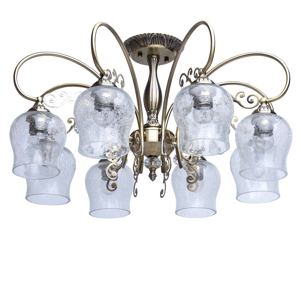 Арматура светильника выполнена из сплава металла и гальванизирована в цвет античной бронзы. Светильник декорирован оригинальными плафонами из прозрачного стекла, обработанного по технологии кракелирования.