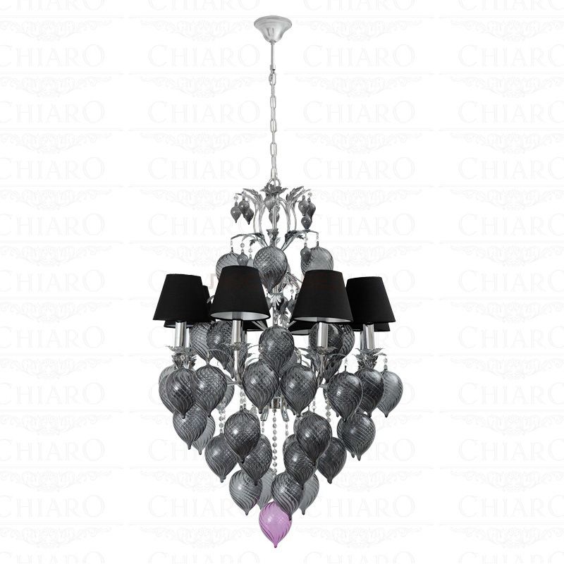 Металлическое основание цвета хрома, объёмные декоративные элементы из дутого стекла дымчатого оттенка, текстильные плафоны