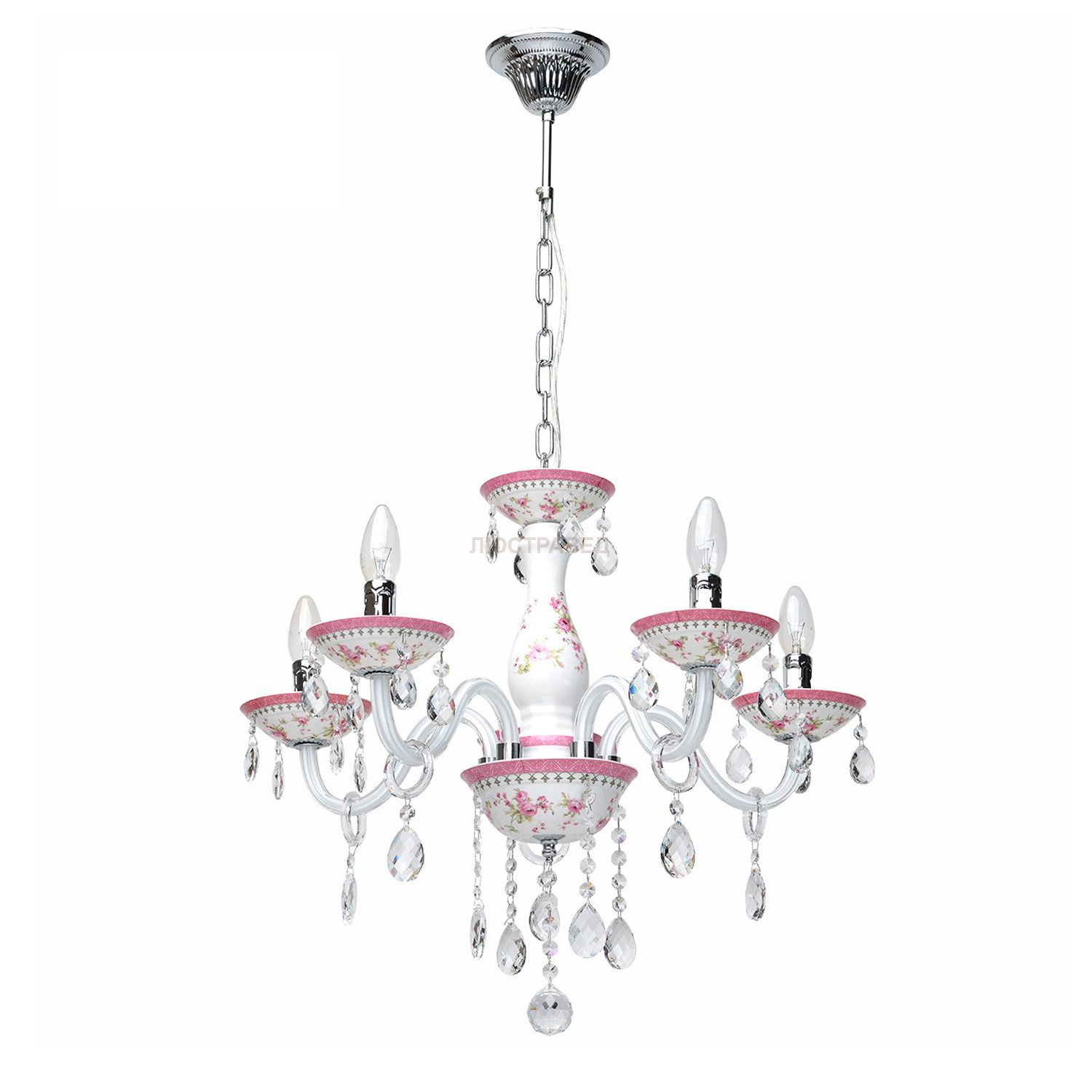 Металлическое основание цвета хрома, рожки из дутого стекла, окрашенные изнутри, декоративные элементы из хрусталя и керамики