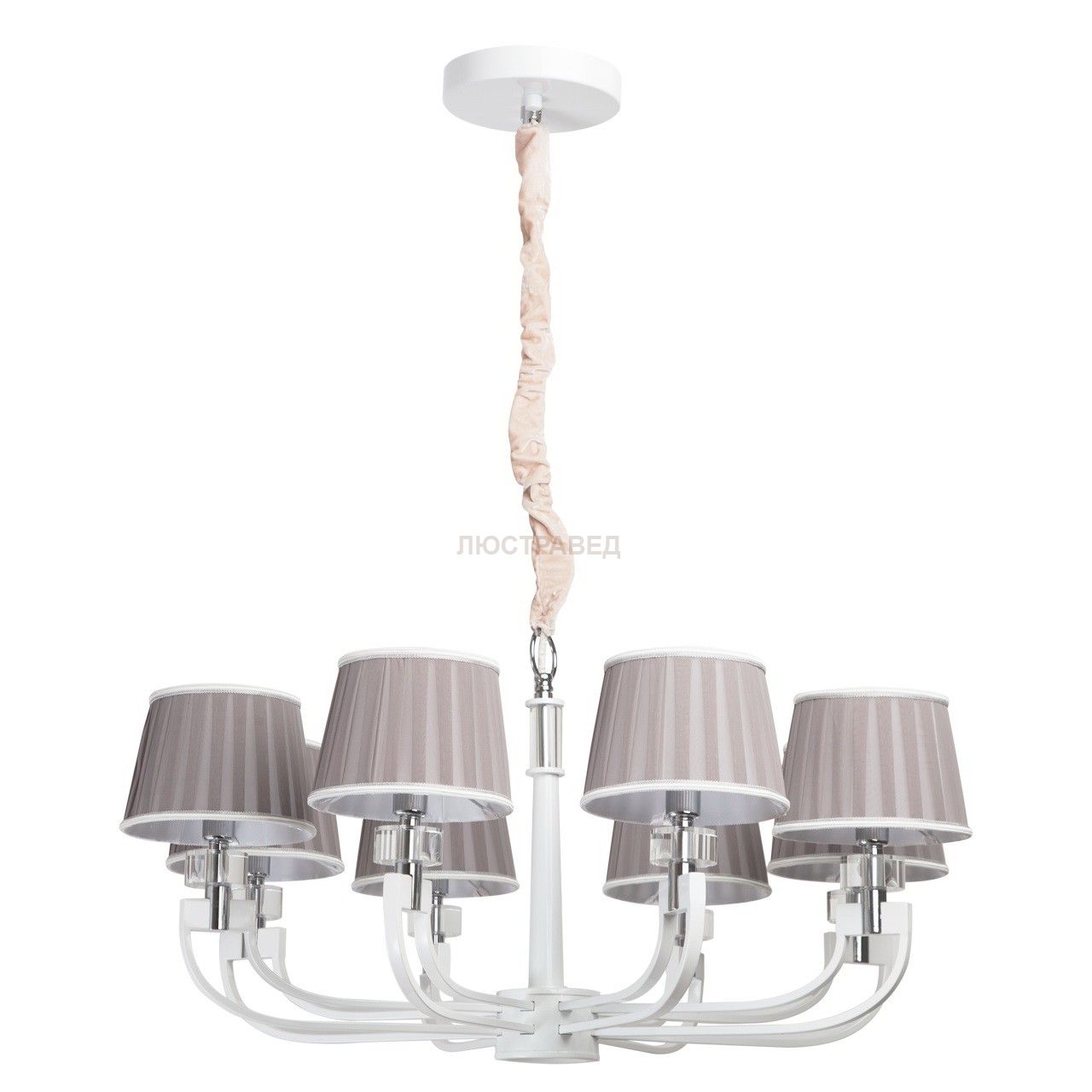 Металлическое основание белого цвета, декоративные элементы из хрусталя, текстильные абажуры