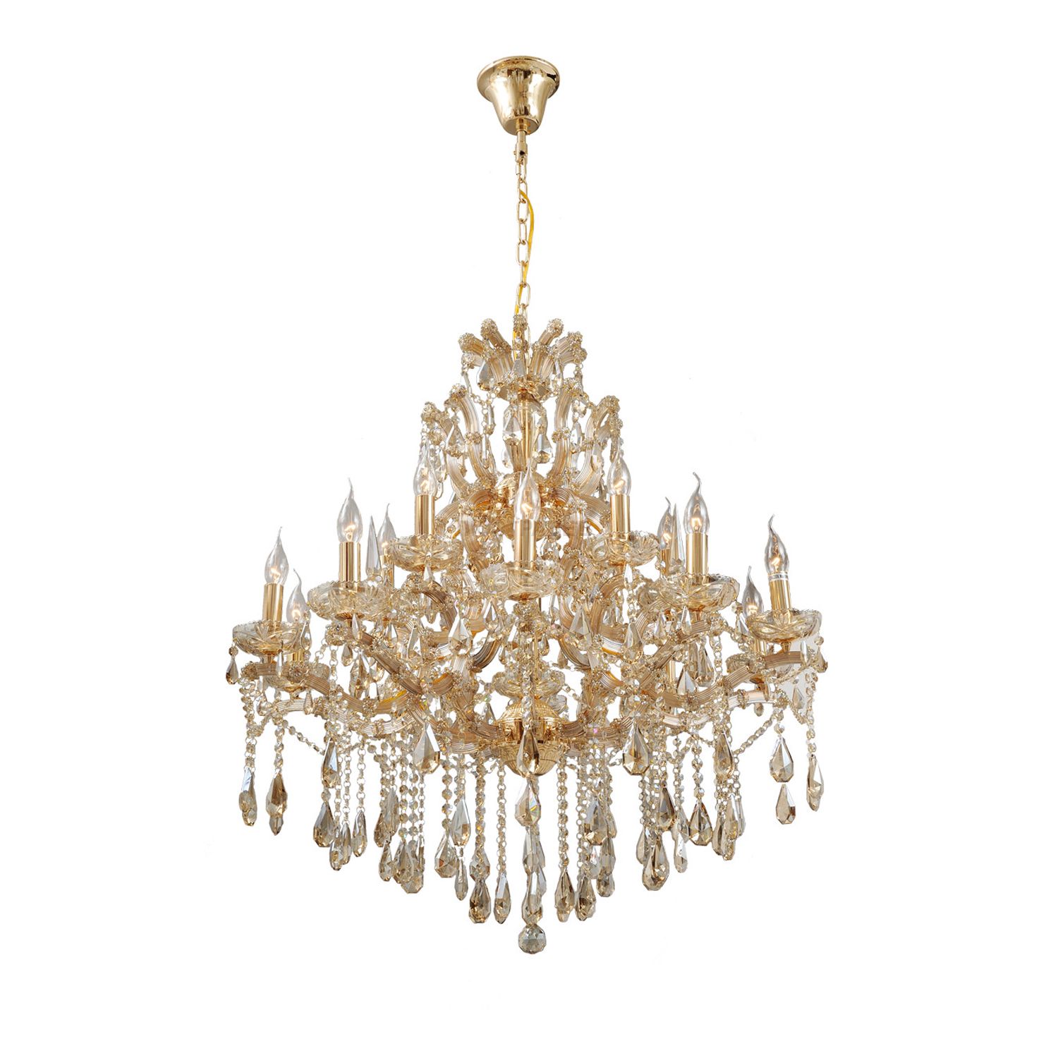 Металлическое основание цвета золота, декоративные элементы из стекла и хрустальные подвески цвета золотистого топаза