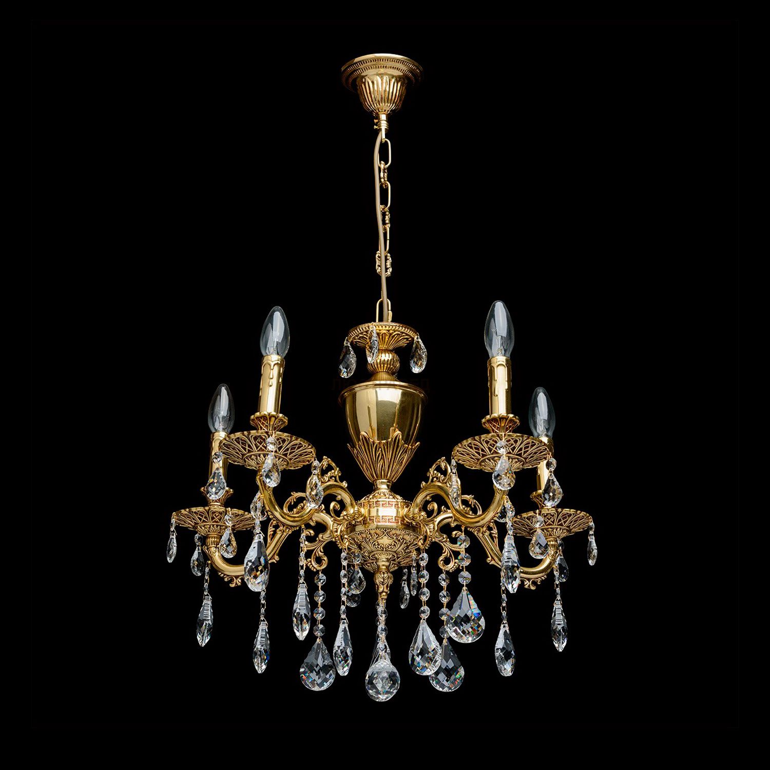 Арматура из благородного сплава – латунь. Использована техника художественного литья. Использована техника художественного литья с последующим патинированием вручную редким цветом «красной патины». Четыре вида хрусталя по форме и размерам кристаллов ТМ F&D crystal высокой категории.