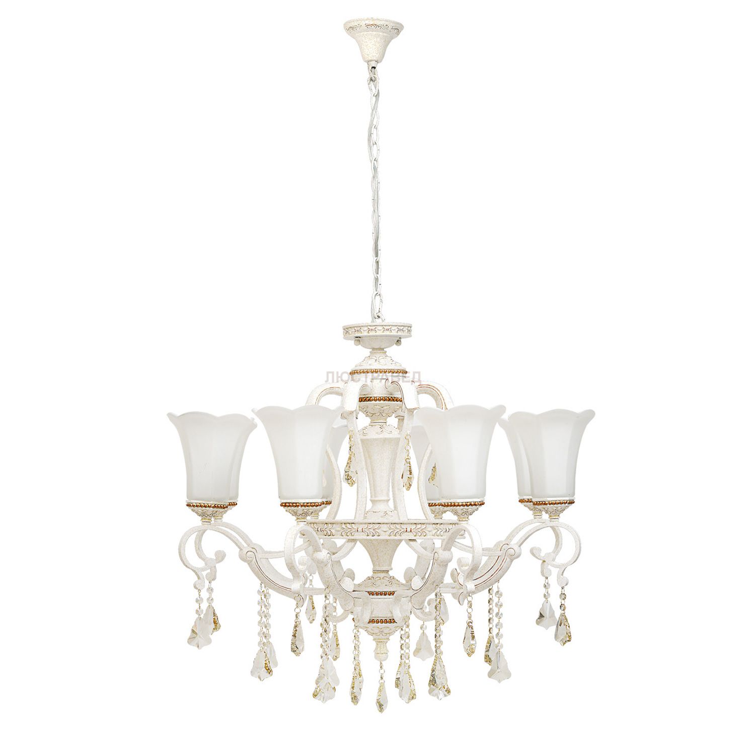 Металлическое основание белого цвета, окрашенное вручную с эффектом старения, декоративные элементы из искусственного каучука,хрусталь,плафоны из матового стекла