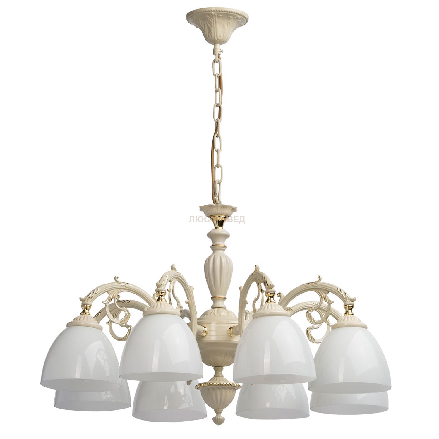 Арматура светильника выполнена из сплава металла и окрашена в цвет слоновой кости с золотой краской. Плафоны выполнен из стекла, окрашенного в массе в белый цвет.