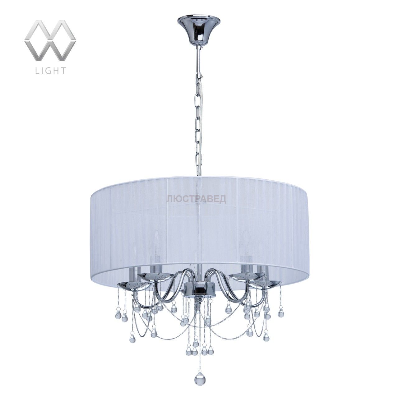 Металлическое основание цвета хрома, абажур из органзы белого цвета, декоративные цепочки в цвет основания, подвесы из прозрачного стекла