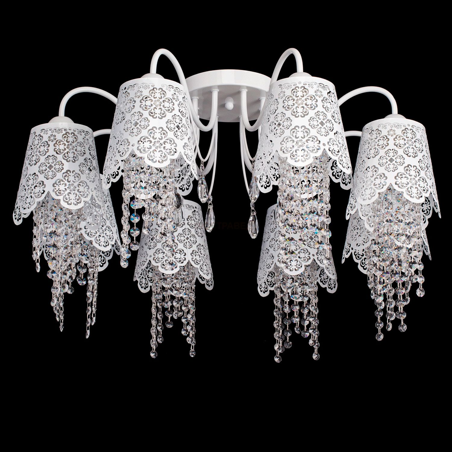 Основание и абажуры изготовлены из крашеного металла белого цвета, декоративные элементы из прозрачного хрусталя