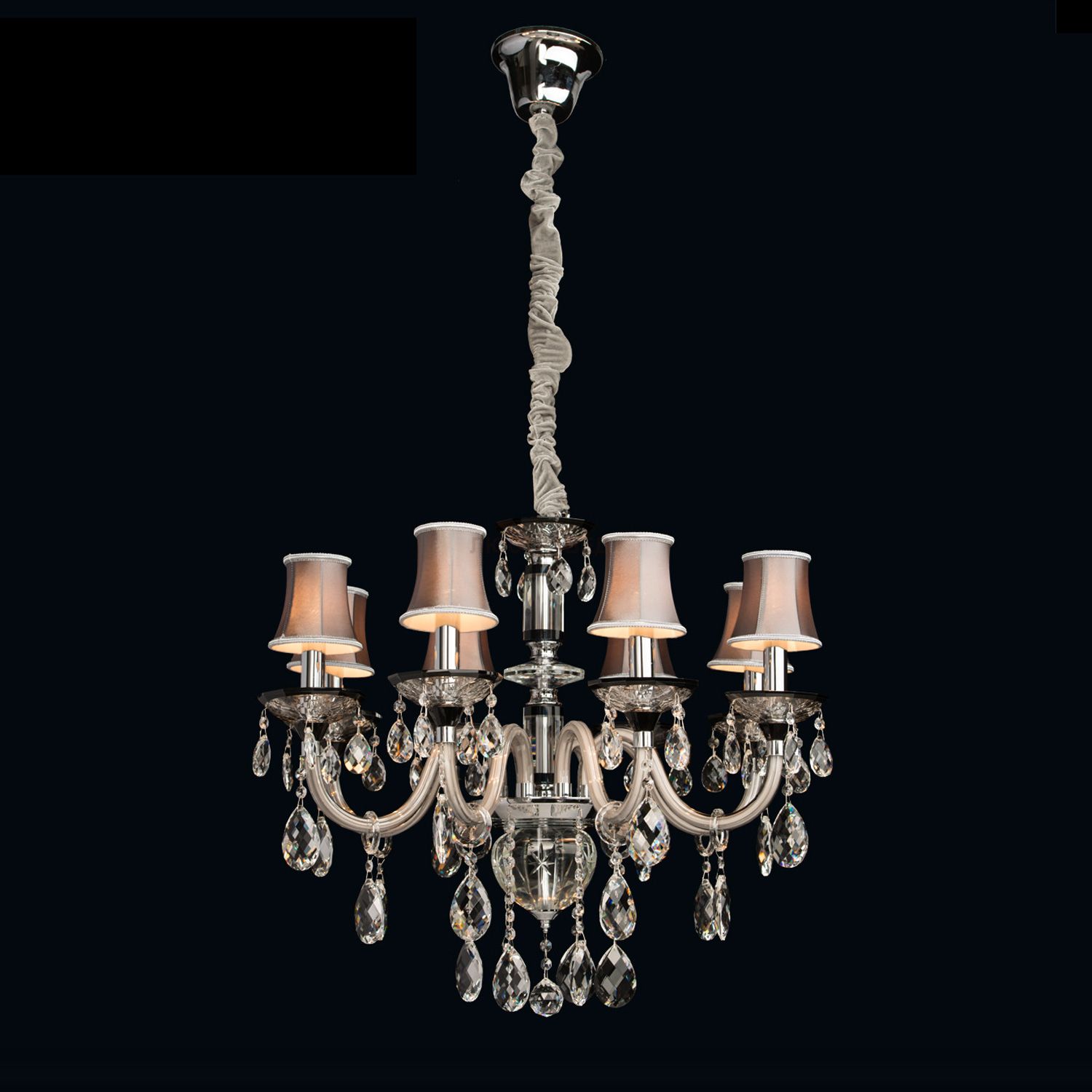 Металлическое основание цвета хрома, декоративные элементы из стекла, хрустальные подвески из прозрачного хрусталя, текстильные абажуры .