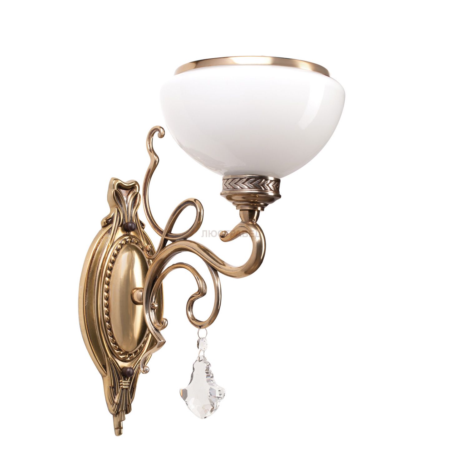 Металлическое основание цвета античной медовой бронзы, плафон из опалового стекла, декоративная подвеска из хрусталя