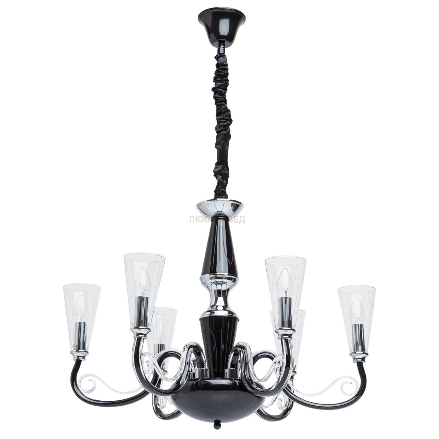 Изящные плафоны декорированы алмазной резьбой. Оригинальное исполнение рожков светильника – внутренне окрашивание черной краской и изящный декор из прозрачных стеклянных элементов. Высокие параметры освещенности.