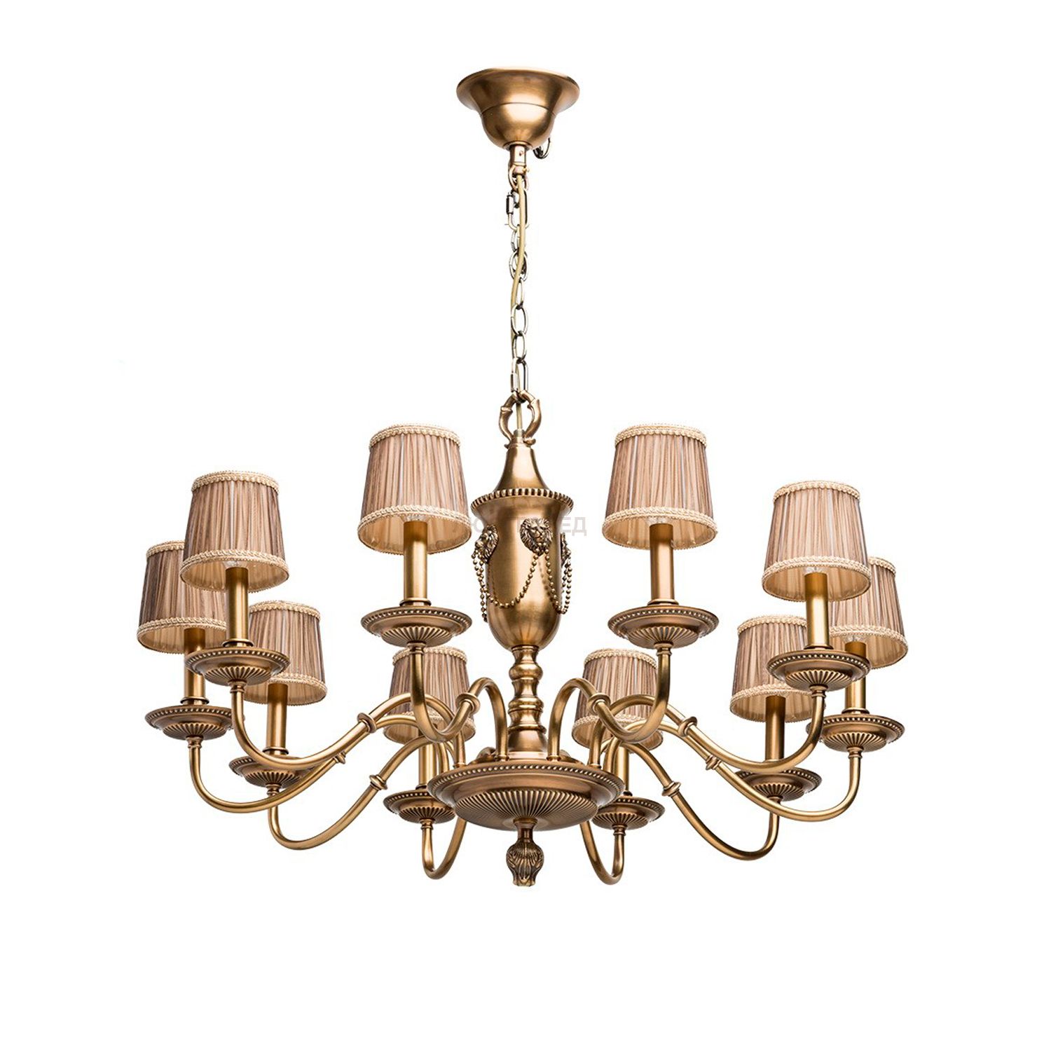 Основание и декоративные элементы из бронзы тёплого оттенка, текстильные абажуры.