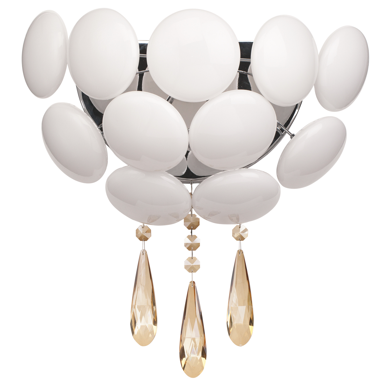 Металлическое основание цвета хрома, декоративные элементы из опалового стекла, хрустальные подвески янтарного цвета.