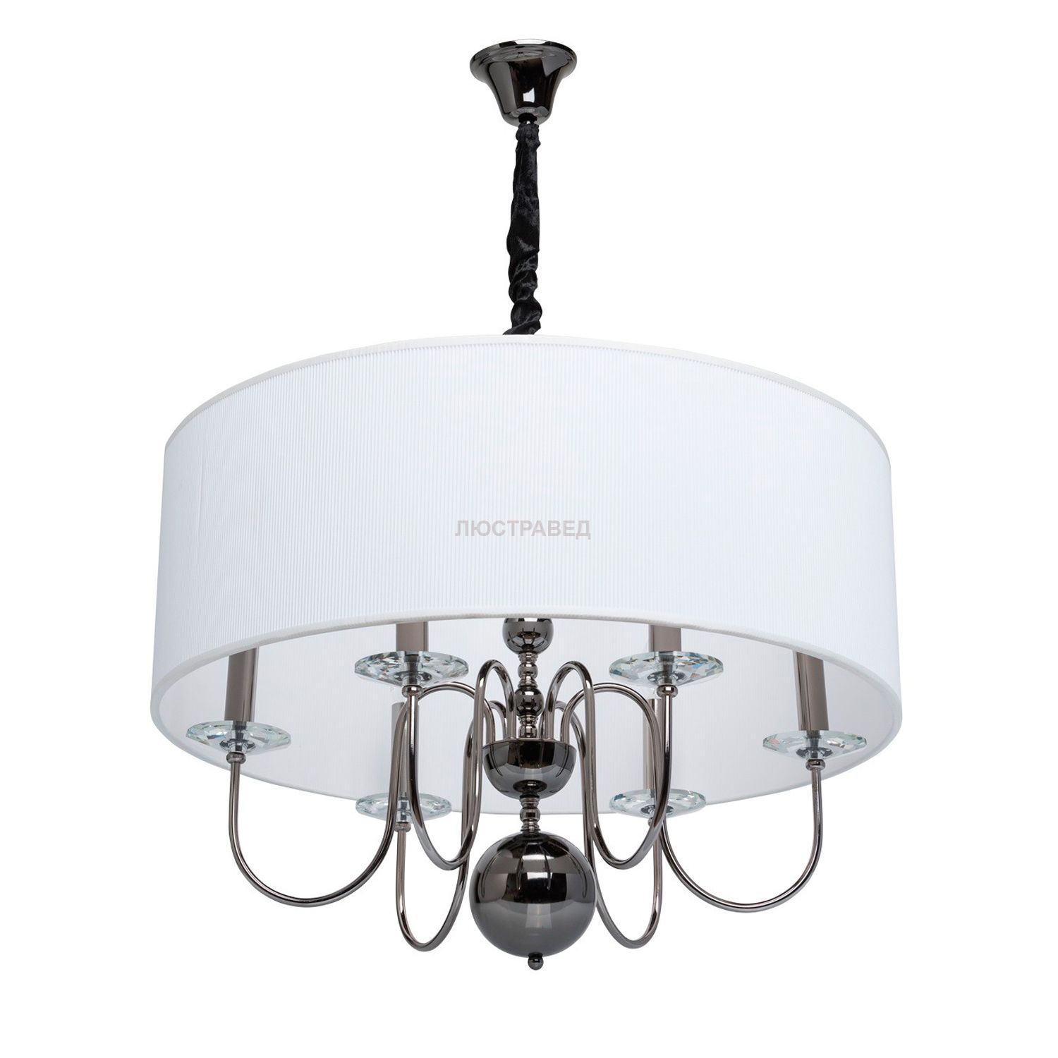 Металлическое основание цвета никеля, декоративные элементы из хрусталя, текстильный абажур