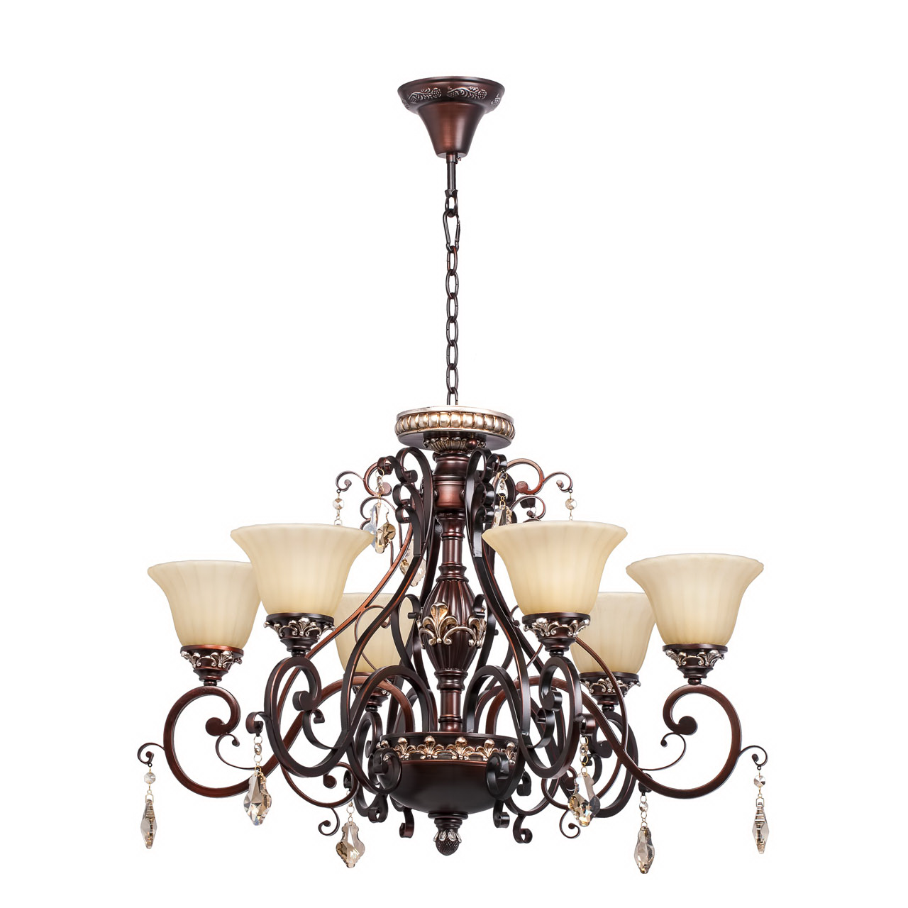 Кованое металлическое основание, декоративные элементы из искусственного каучука цвета темного кофе, плафоны из матового стекла, декоративные элементы из хрусталя цвета топаза