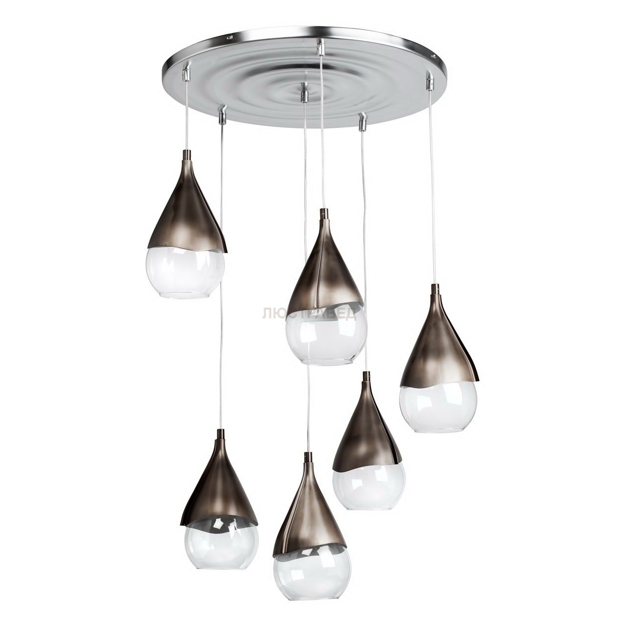 маталлческое крепление цвета меди с эффектом старения, плафоны из прозрачного стекла в форме капель