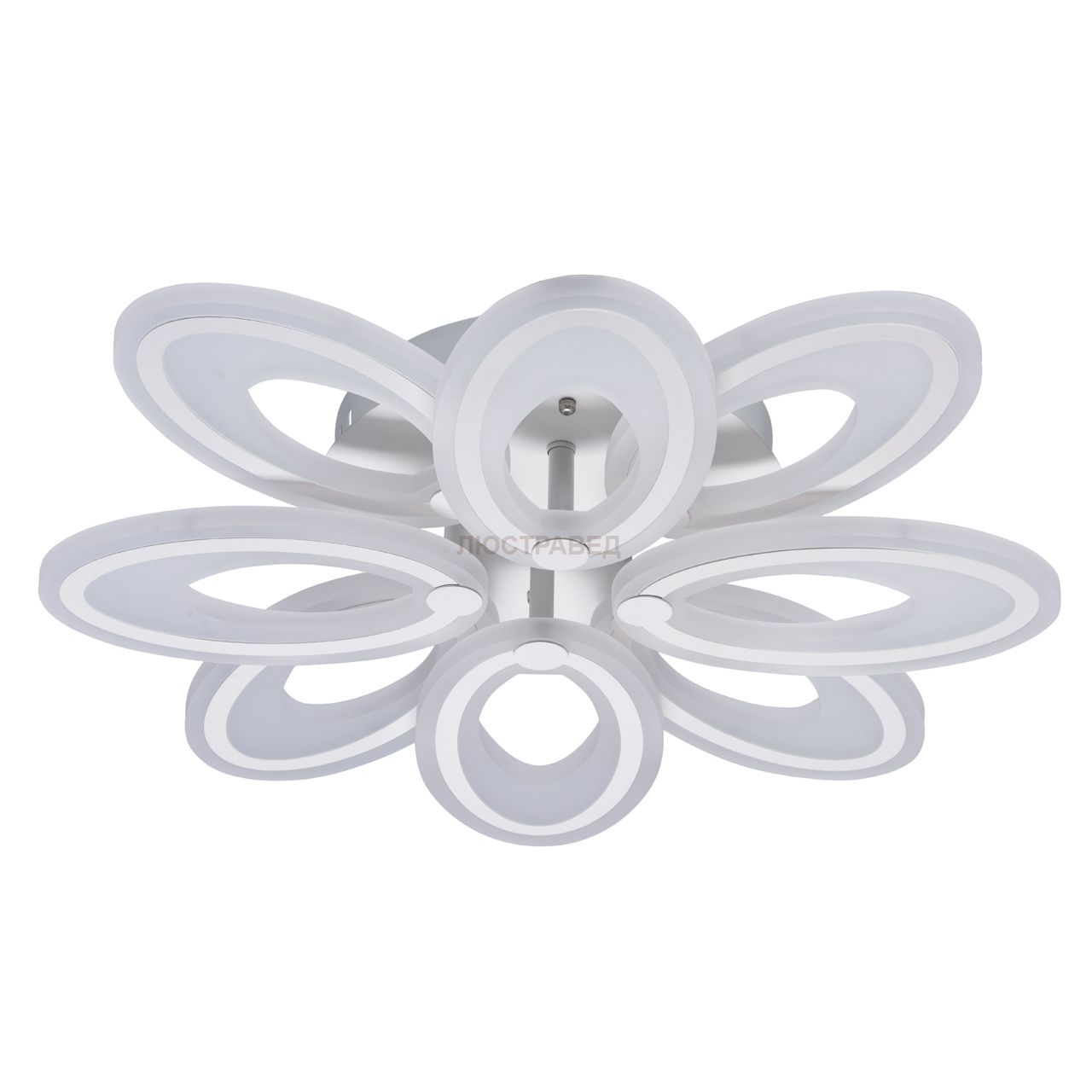 Люстра выполнена в оригинальном современном стиле.Встроенные светодиоды экономят электроэнергию и долговечны в использованииБлизкое расположение к потолку дает возможность разместить светильник в помещениях со стандартными потолками.Оригинальная форма цветка и универсальный белый цвет сделает люстру украшением любого современного интерьера