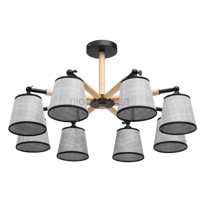 Основание светильника выполнено из металла и окрашено в черный цвет.Потолочная чаша, корпус: обработка на токарном станке.Декоративные элементы на центральном стержне, на рожках и декоративная гайка: дерево гевея.Абажуры - фактурный текстиль серого цвета с термостойким акрилом внутри. Верхняя и нижняя часть абажура декорирована кантом черного цвета. Световые элементы снабжены поворотными механизмами.
