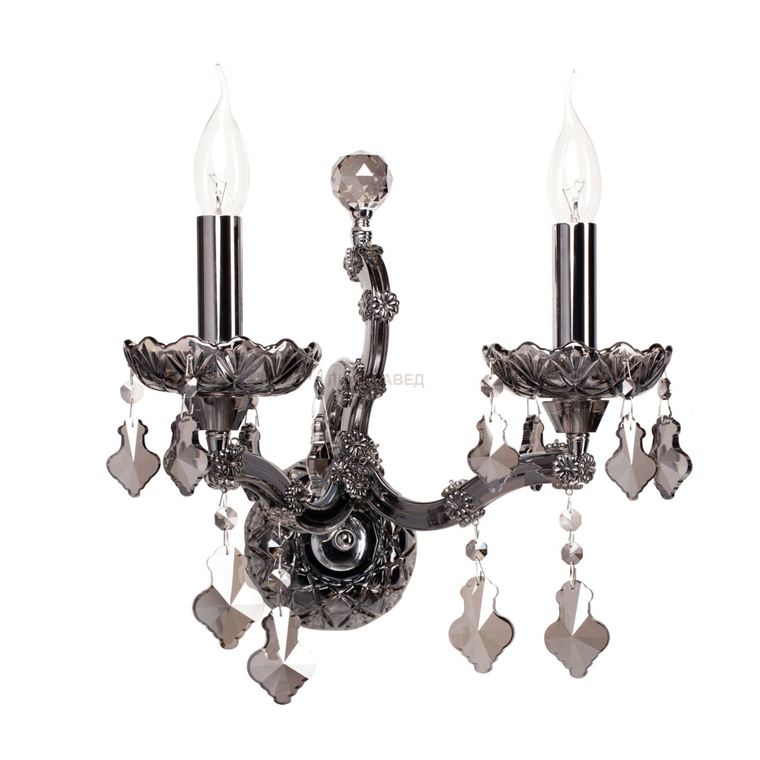 Металлическое основание цвета хрома, стеклянные накладки из выдувного стекла и хрустальные подвески цвета антрацит