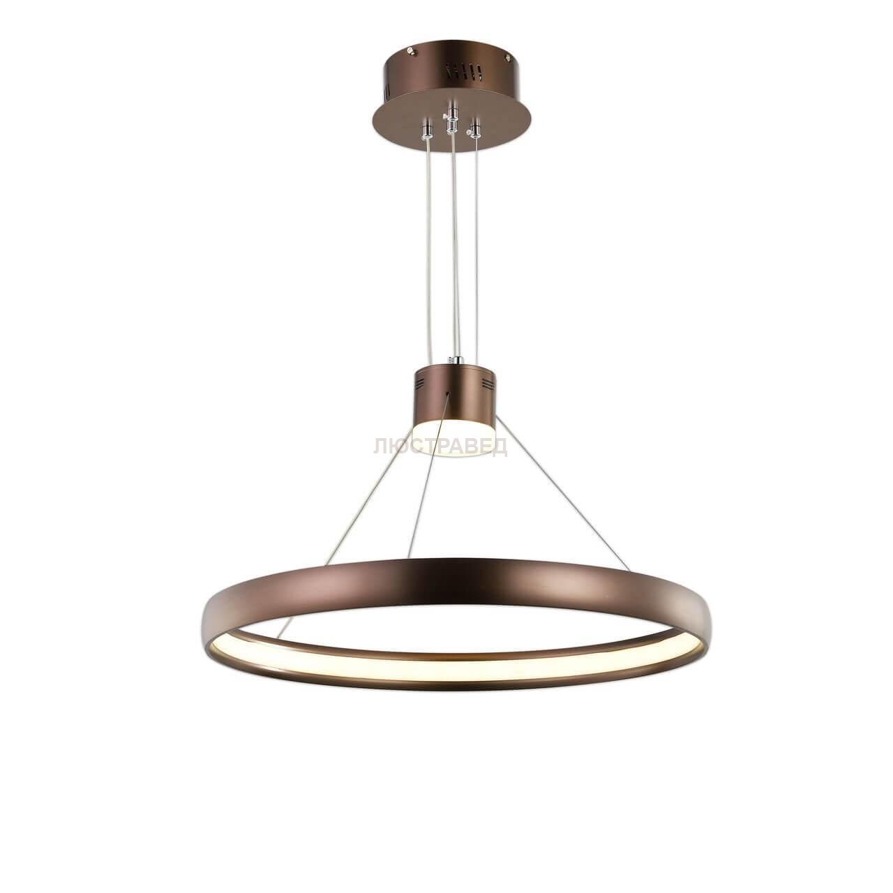 золотисто-кофейный цвет каркаса, белый акриловый рассеиватель для ленты LED, поднимая или опуская центральный светильник со стеклянным плафоном можно регулировать общую высоту люстры
