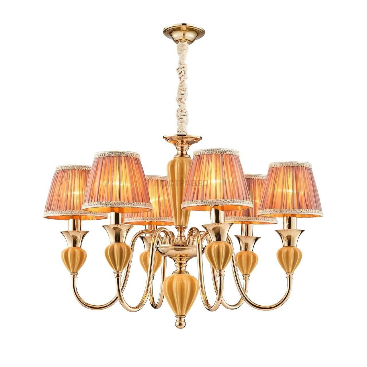 каркас цвета золотой гальваники, декоративные элементы из керамики янтарного цвета, абажуры из пыльно-розовой ткани