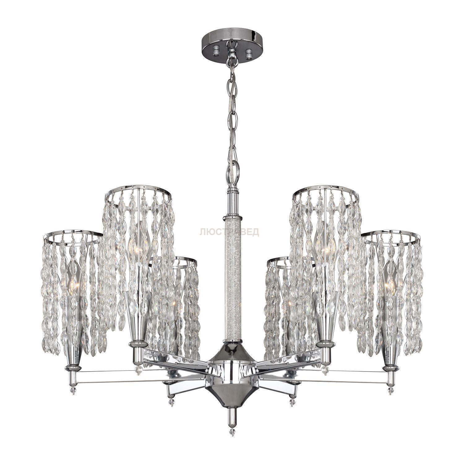 каркас цвета хром, центральный стеклянный цилиндр декорирован внутри кристаллами, подвески из хрусталя оригинальной формы