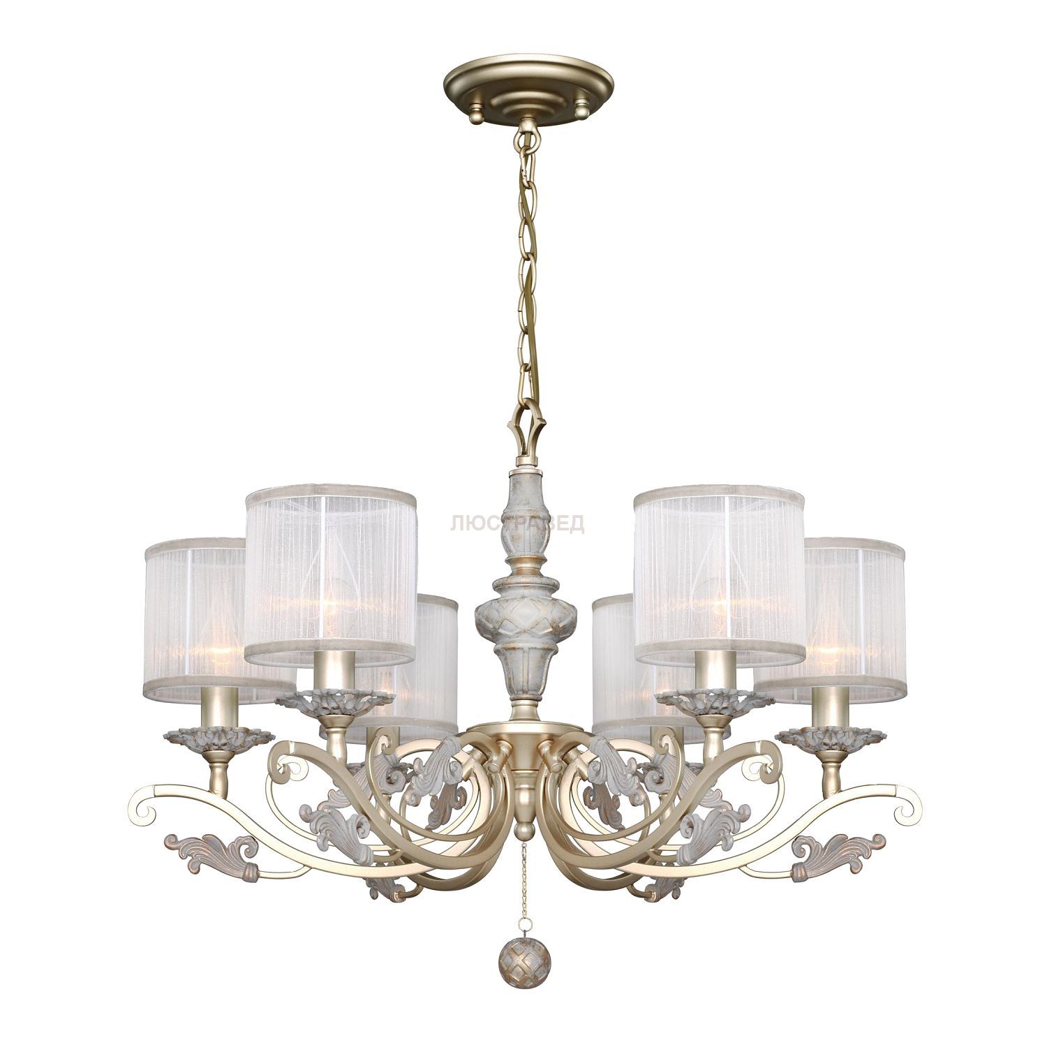 каркас светильника окрашен в золотистый цвет в сочетании с благородным серым с золотой патиной, тканевые абажуры из белой органзы.