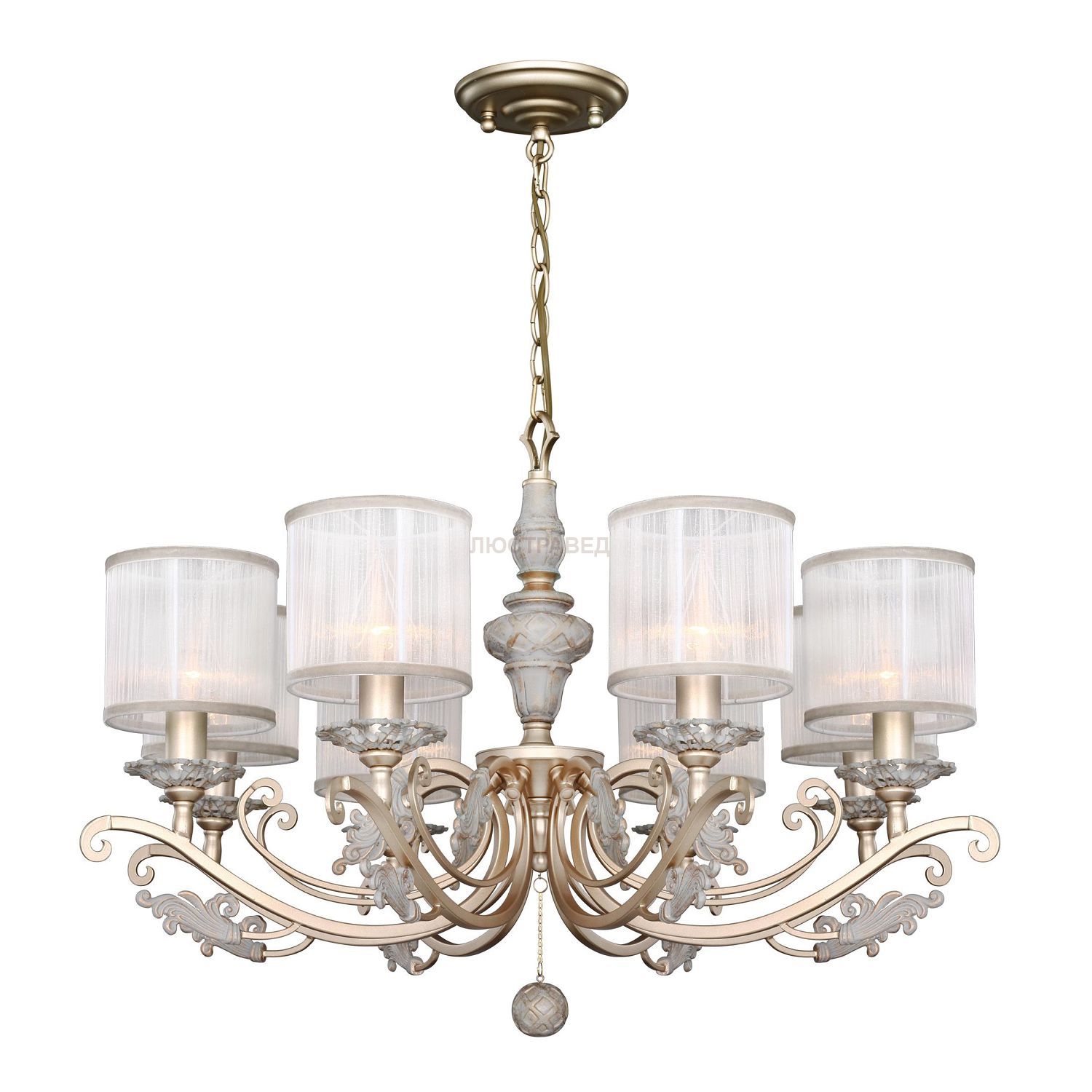 каркас светильника окрашен в золотистый цвет в сочетании с благородным серым с золотой патиной, тканевые абажуры из белой органзы.