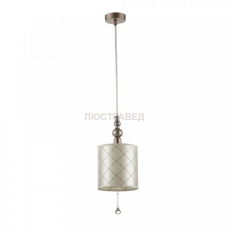 Арматура из металла. Абажур из ПВХ покрыт тканью с узором в стиле ар-деко. Подвески из *хрусталя.