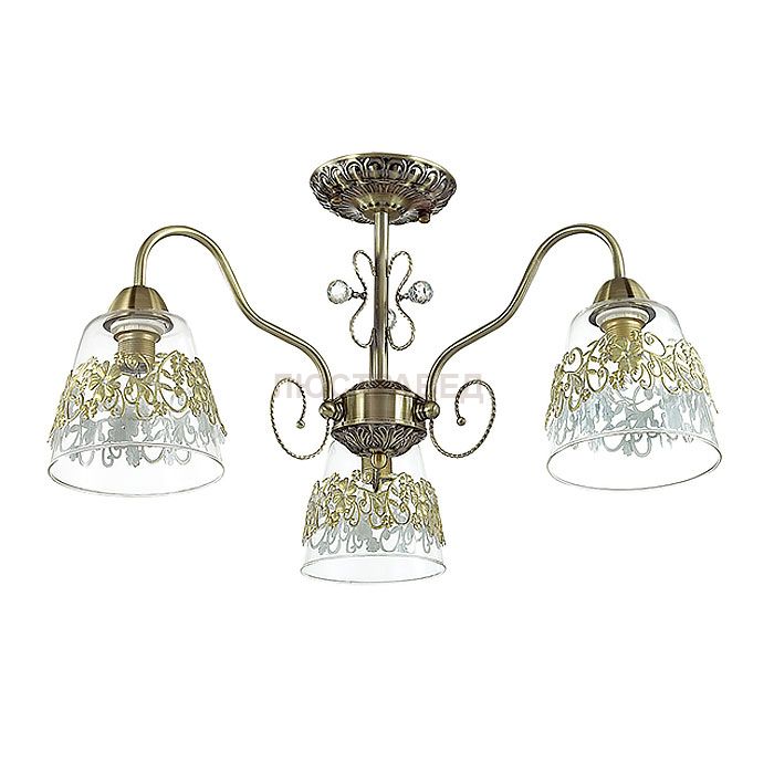 Арматура, декор: металл, центральная штанга декорирована хрустальными элементами; плафон: стекло с ажурным металлическим декором