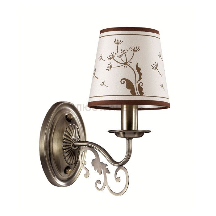Арматура, декор: металлическая арматура украшена ажурными металлическими элементами; плафон: тканевый абажур с принтом цвета кофе