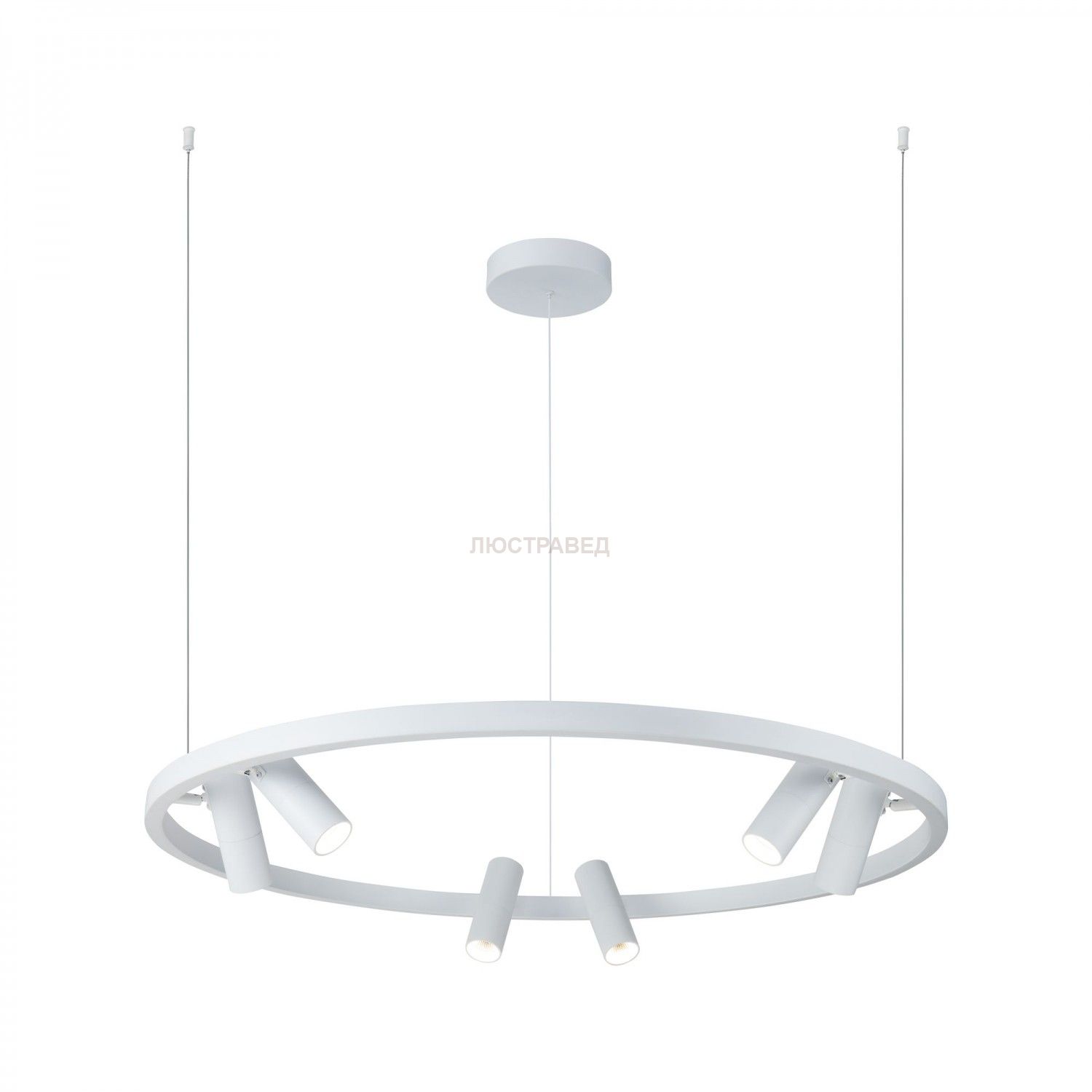 Каркас из металла. Основание в форме круга. Регулировка положения спотов по горизонтали (340°), по вертикали (90°). Споты не перемещаются по кольцу. LED-модуль.