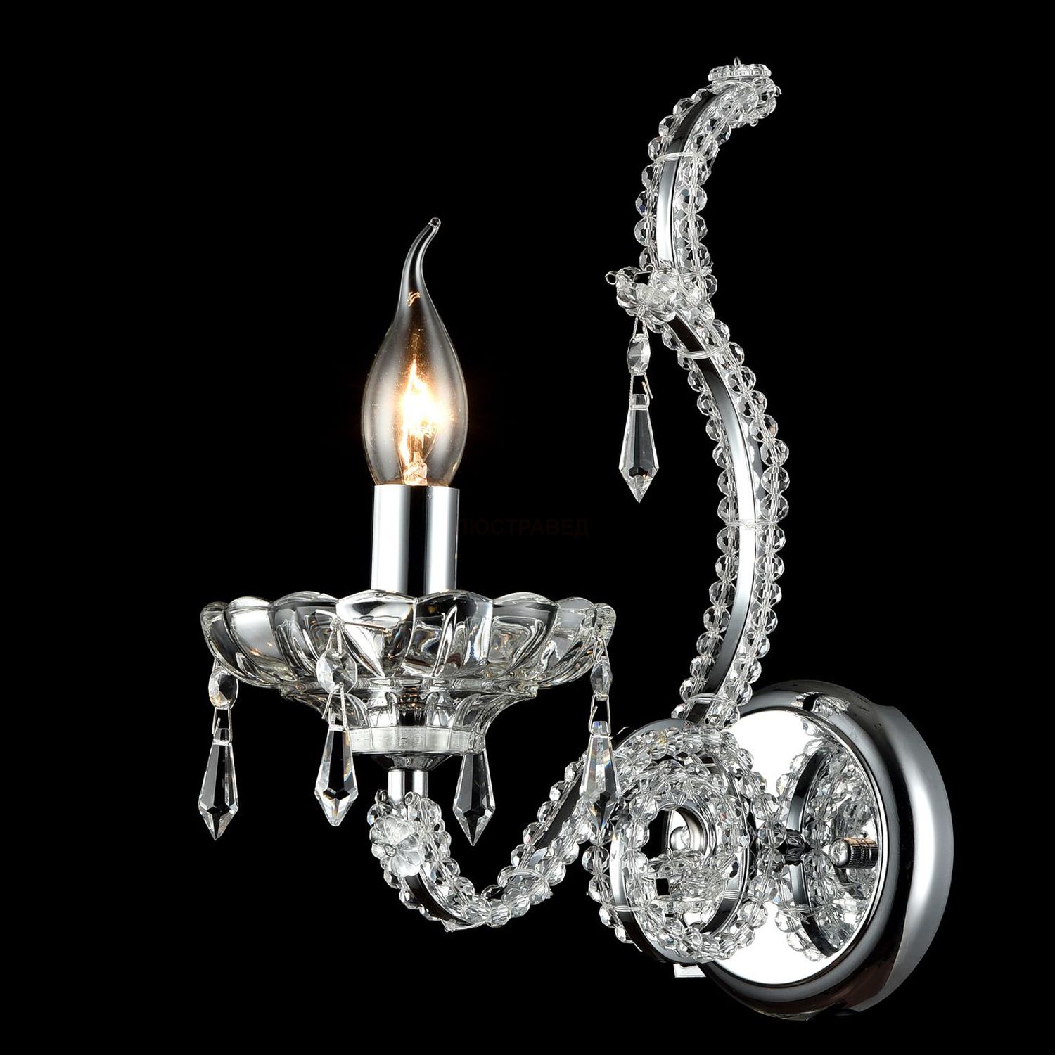 Арматура из металла с хромовым покрытием украшена *хрустальными бусинами. Центральная часть светильника украшена *хрустальным «пиком».