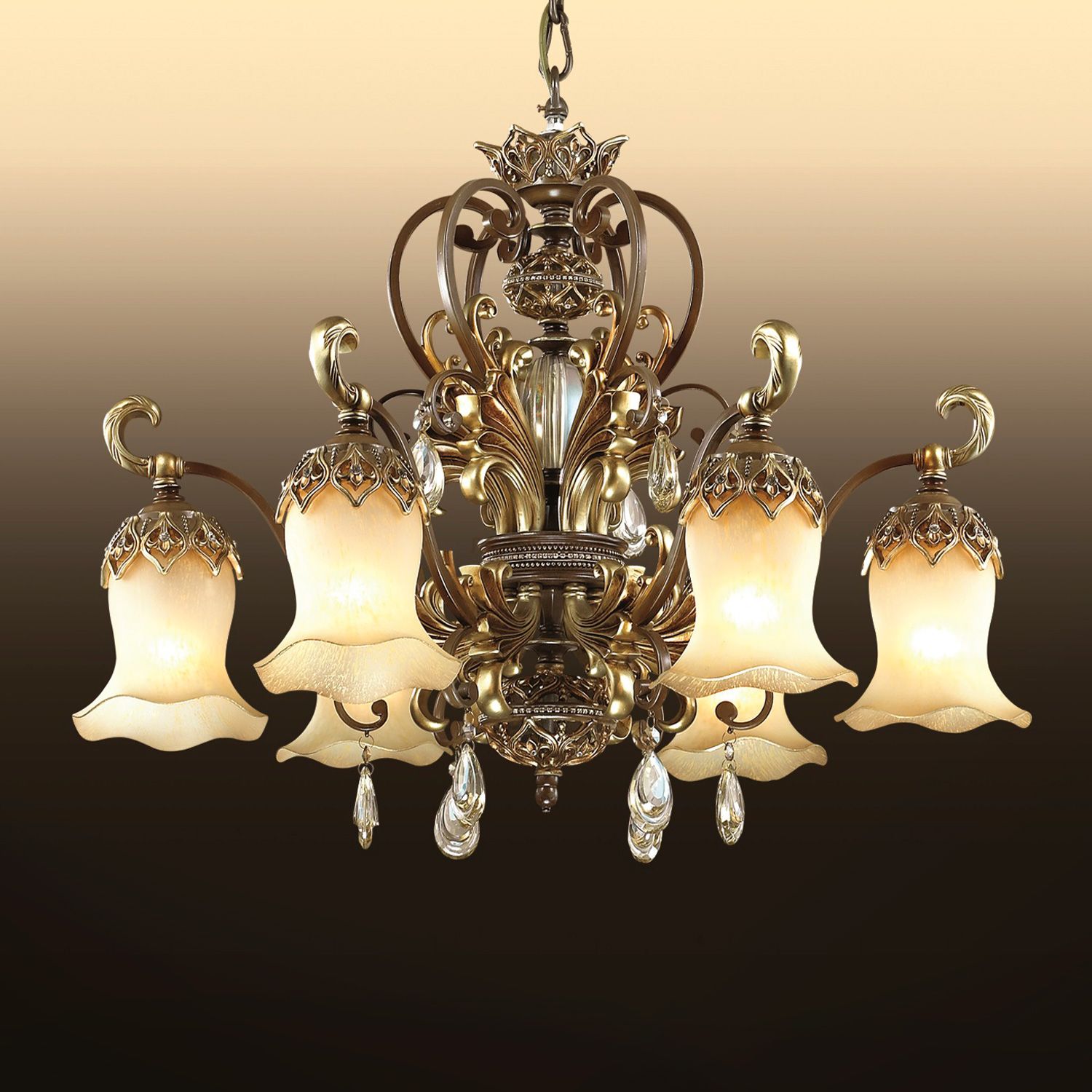 плафон: фигурный из молочного стекла, арматура: металл, декор: полиэфирная смола на декоре основания, подвески из хрусталя